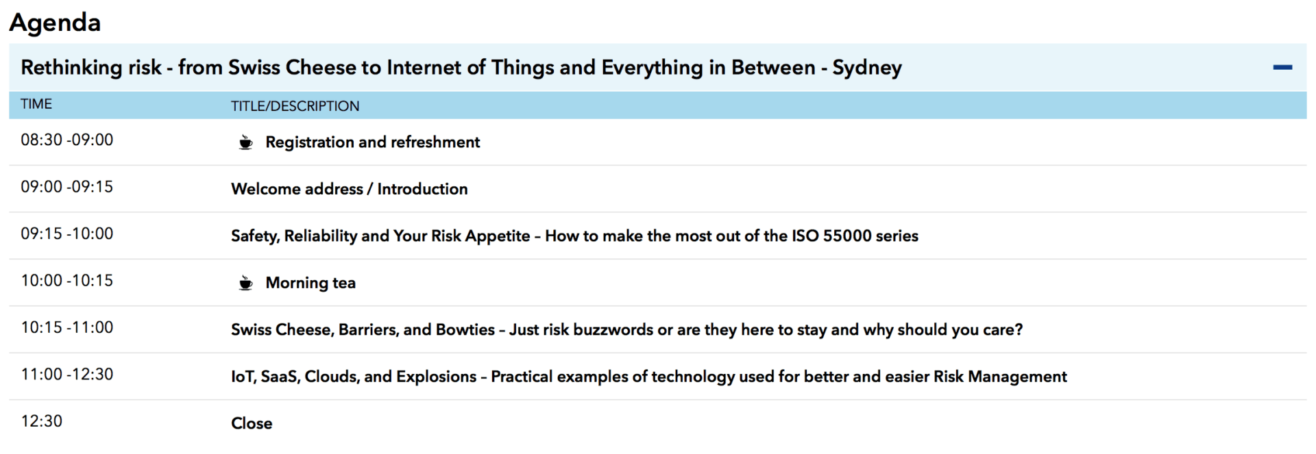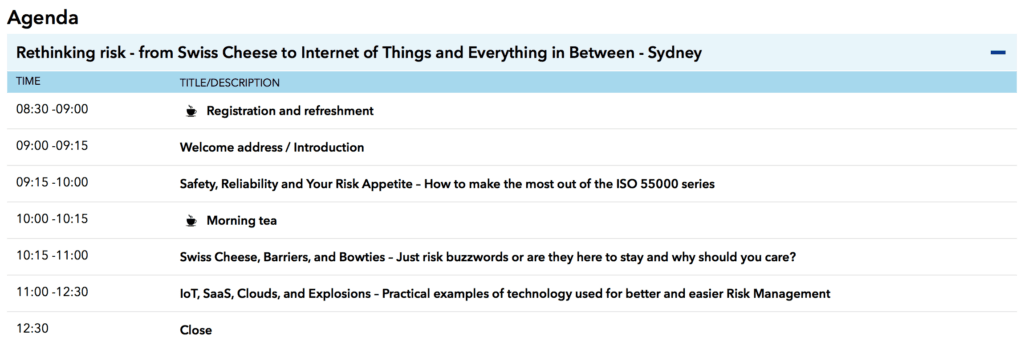 The free half-day seminars will cover key trends in risk management over the past 12 months, from swiss cheese to internet of things and everything in between. The closing session will include a demonstration of how you can use XMPro to connect IoT to your risk repository system. Here are the details: