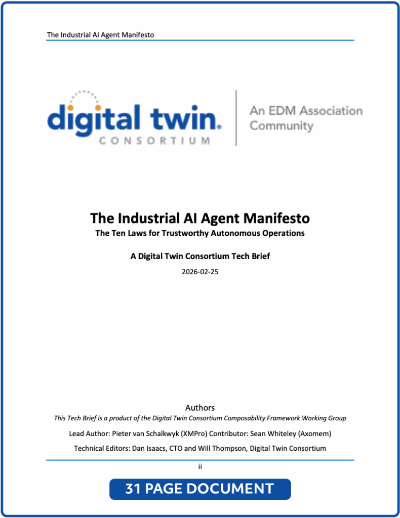 DALLAS, TX — [DATE], 2026 — The Digital Twin Consortium (DTC) has published the Industrial AI Agent Manifesto — the industry's first comprehensive governance framework for deploying trustworthy AI agents in safety-critical industrial environments. XMPro CEO and founder Pieter van Schalkwyk served as lead author and chair of the DTC Composability Framework Working Group that developed the framework.