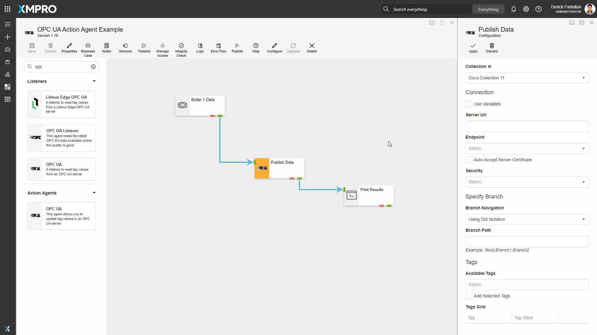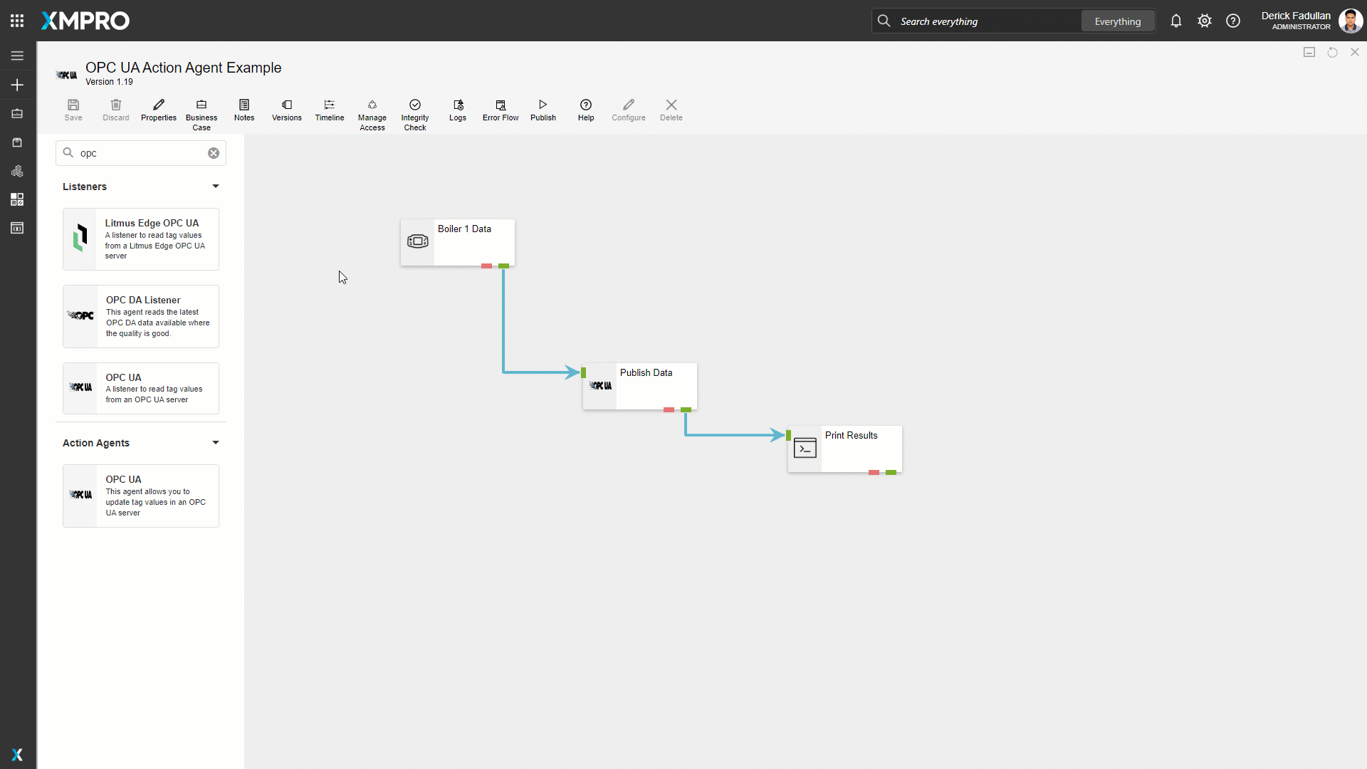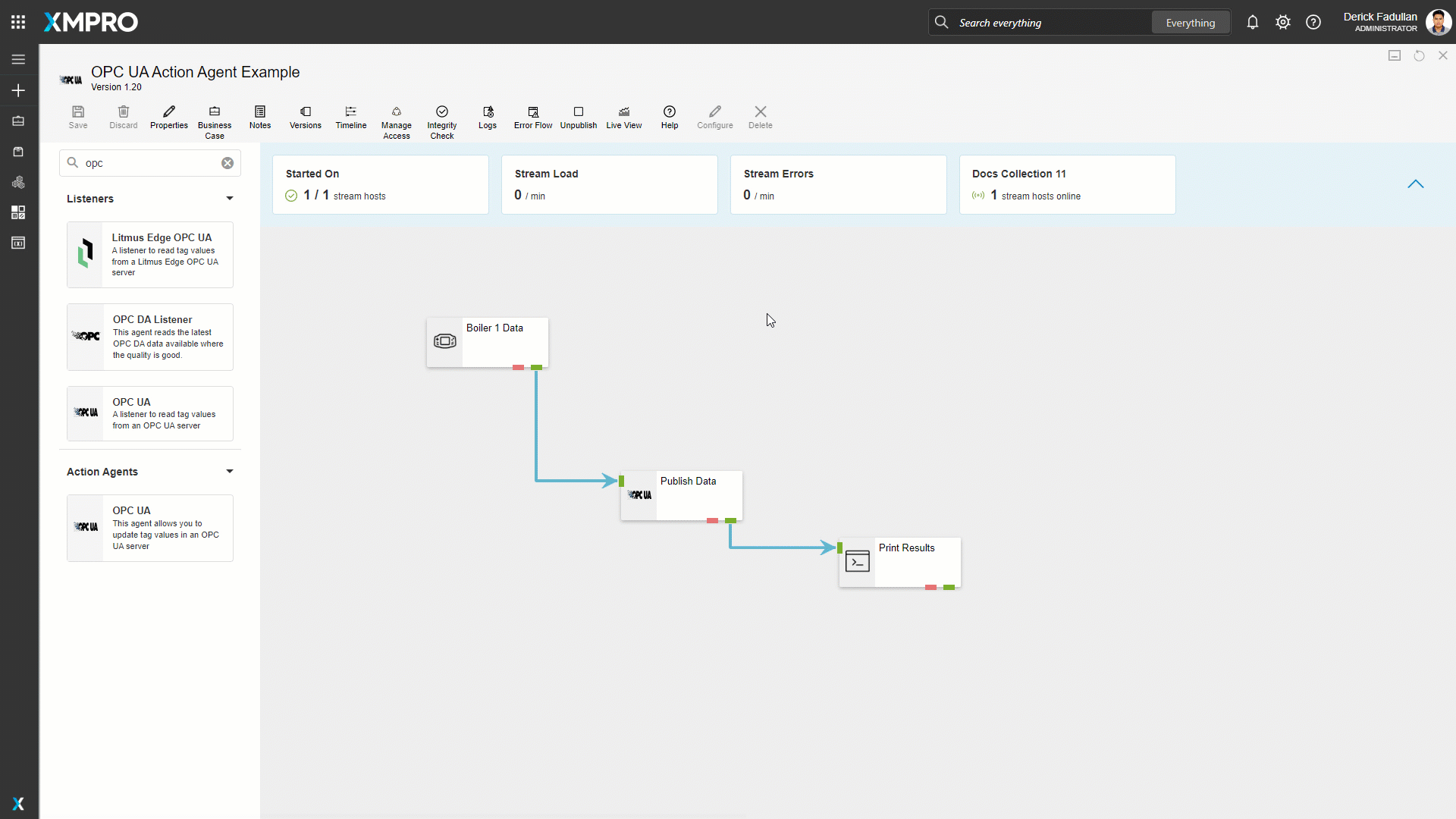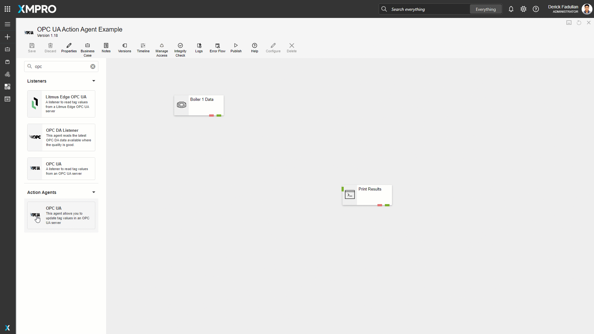 Drag the OPC UA Action Agent onto the canvas and rename it. Link the input endpoint to the Boiler 1 Data, then the output endpoint to the printer, and save the Data Stream.