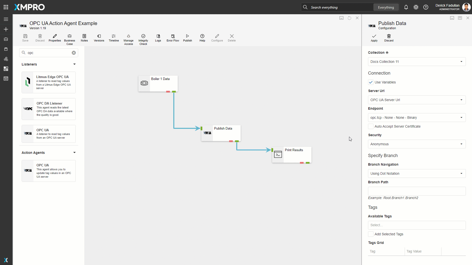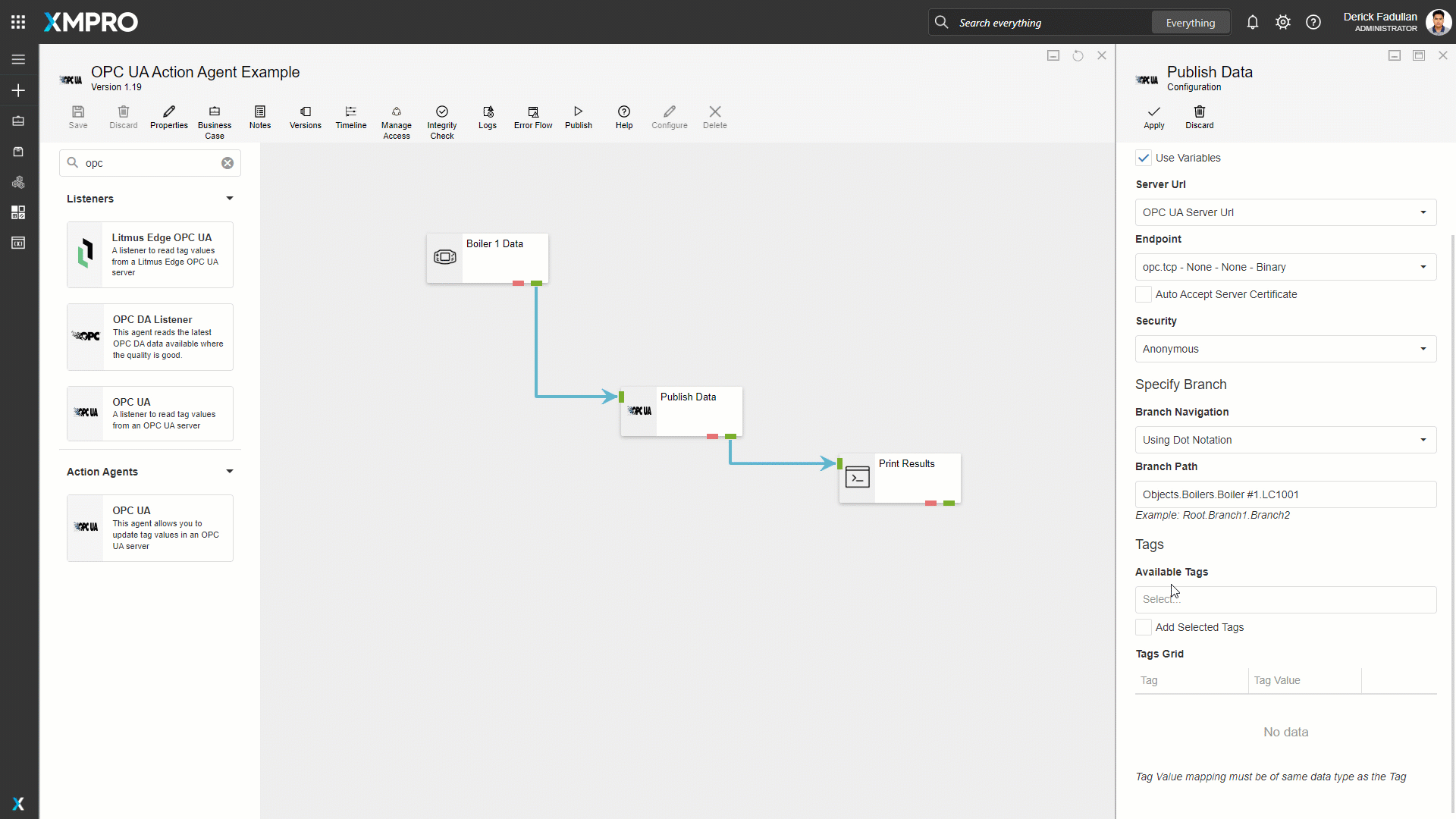 The Action Agent allows you to publish the supplied tag values and its timestamp to the selected nodes on the OPC UA Server.