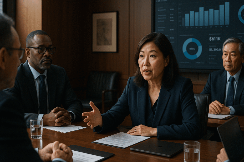 The executive conference room offers a stark contrast to the operations center—quiet, wood-paneled, and designed for strategic discussions rather than tactical operations. Today's quarterly business review has brought together the company's senior leadership, including Eleanor Reed, CFO, and James Nakamura, CEO.