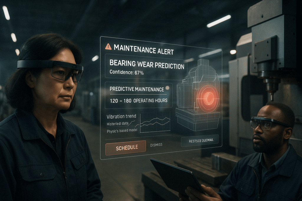 The predictive maintenance system shows a detailed analysis: based on historical patterns and physics-based modeling, the specific bearing will likely fail within 120-180 operational hours. The system has automatically calculated the optimal maintenance window based on production schedules and part availability.