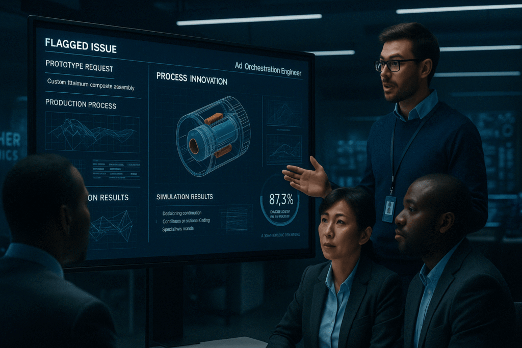 "This one's particularly interesting," he begins. "VectorSpace Dynamics has requested a custom titanium-composite assembly with specifications that deviate from our standard parameters. Our Process Innovation Agent developed a novel manufacturing method that theoretically satisfies their requirements—but the approach has no production history."