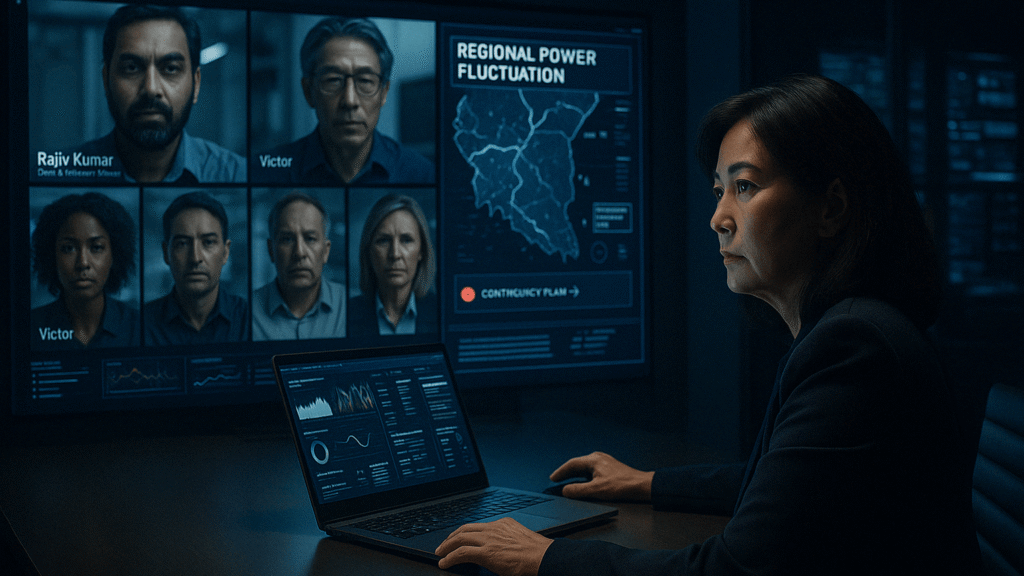 On the video wall, faces appear one by one: the Malaysian plant manager, system engineers, and key department heads. The situation is tense but controlled.