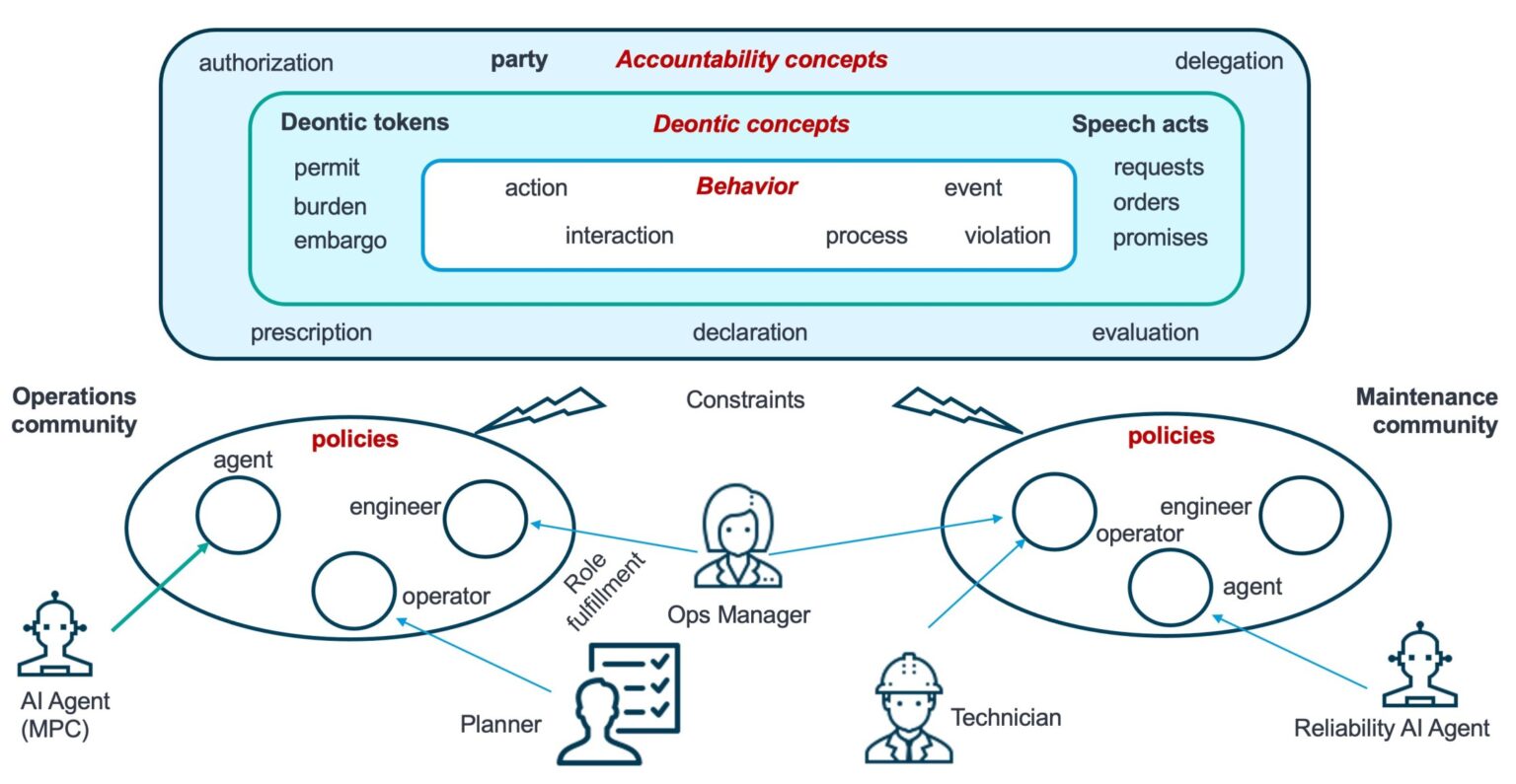 - Organizational or legal policies that cover constraints over behavior of both the actors (parties and AI agents) and collaboration structures, providing guardrails over their autonomous behavior.