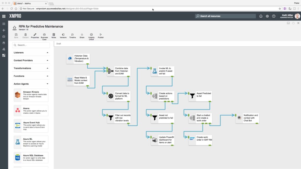Not all RPA tools are created the same. Some are better suited to application “screen scraping” in legacy applications in banking or insurance. Others are better to assist customer contact center operators and a CRM-centric. Only XMPro is suited to industrial [Robotic] Process Automation. XMPro’s unique visual approach simplifies the process to create RPA streams that cater for industrial IoT scenarios: