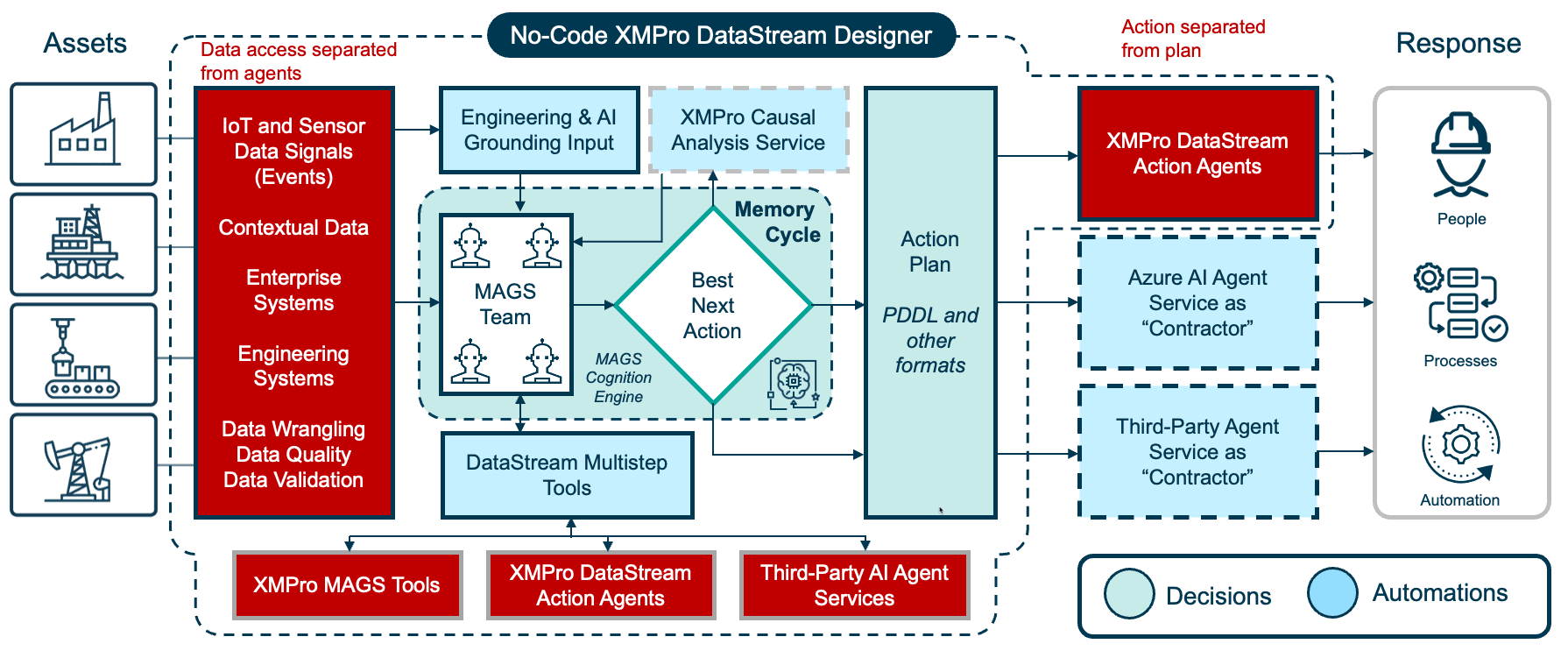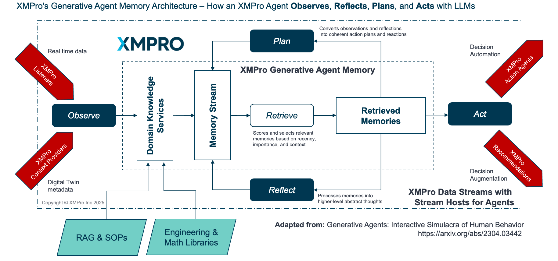 This limitation is by deliberate design. The Agent Memory Cycle can think about taking actions, but it cannot actually implement them without the mediation of another system component—the XMPro DataStream.