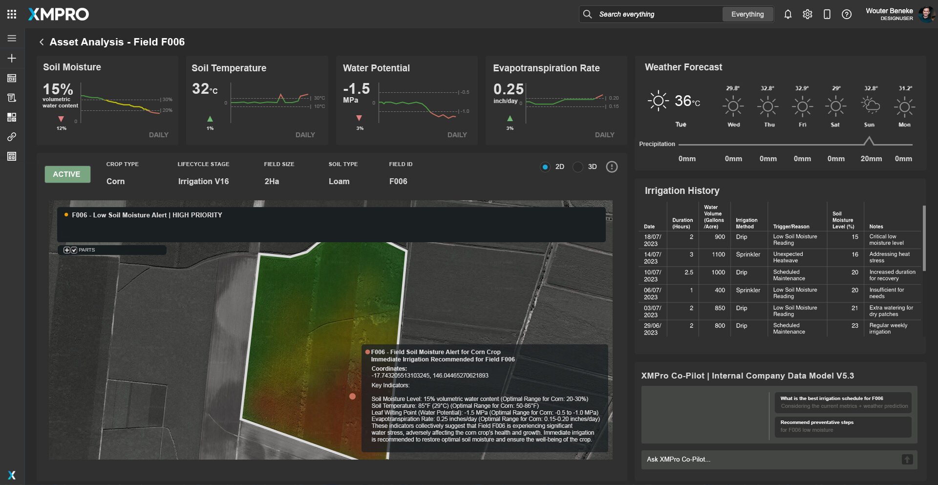 Incorporating XMPro Co-Pilot, this feature utilizes AI, trained on datasets such as historical soil moisture data, weather patterns, and crop-specific water needs, to offer targeted guidance for managing Field F006. This AI-driven assistance supports informed irrigation decision-making and strategy optimization.