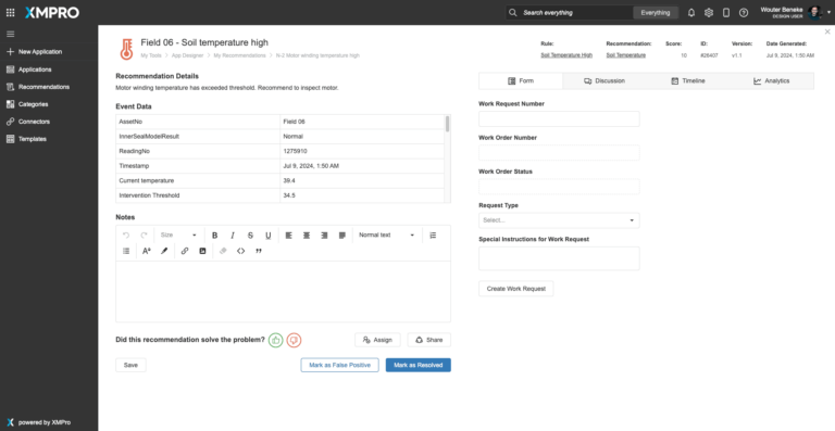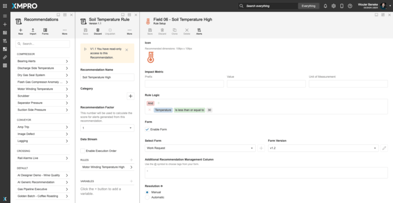 XMPRO Recommendations are advanced event alerts that combine alerts, actions, and monitoring. You can create recommendations based on business rules and AI logic to recommend the best next actions to take when a certain event happens. You can also monitor the actions against the outcomes they create to continuously improve your decision-making.Figure 1. Field 06 Soil Temperature High Recommendation