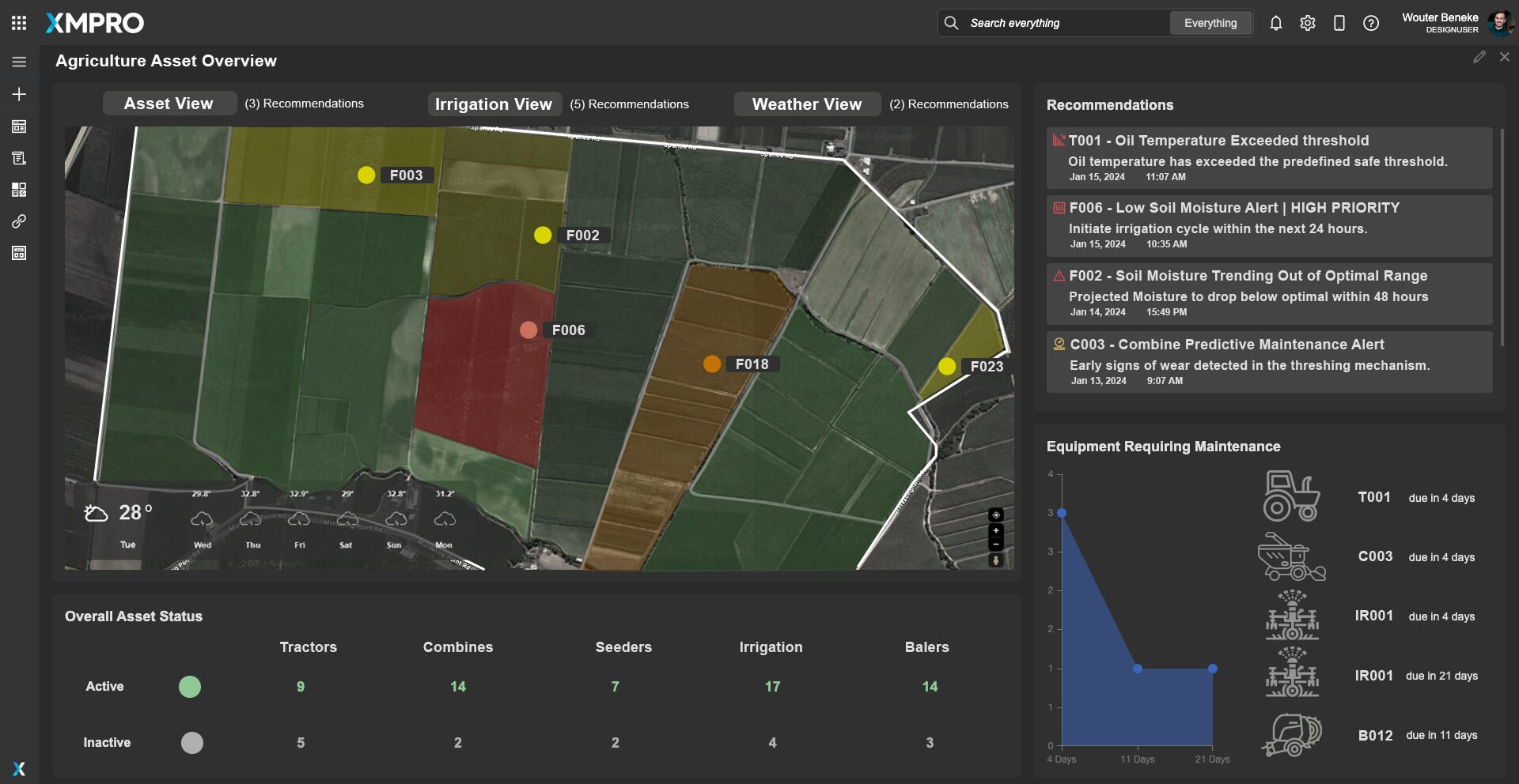The XMPro App Designer is a no code event intelligence application development platform. It enables Subject Matter Experts (SMEs) to create and deploy real-time intelligent digital twins without programming. This means that SMEs can build apps in days or weeks without further overloading IT, enabling your organization to accelerate and scale your digital transformation.Figure 1. Real-Time Agriculture Asset Overview Dashboard