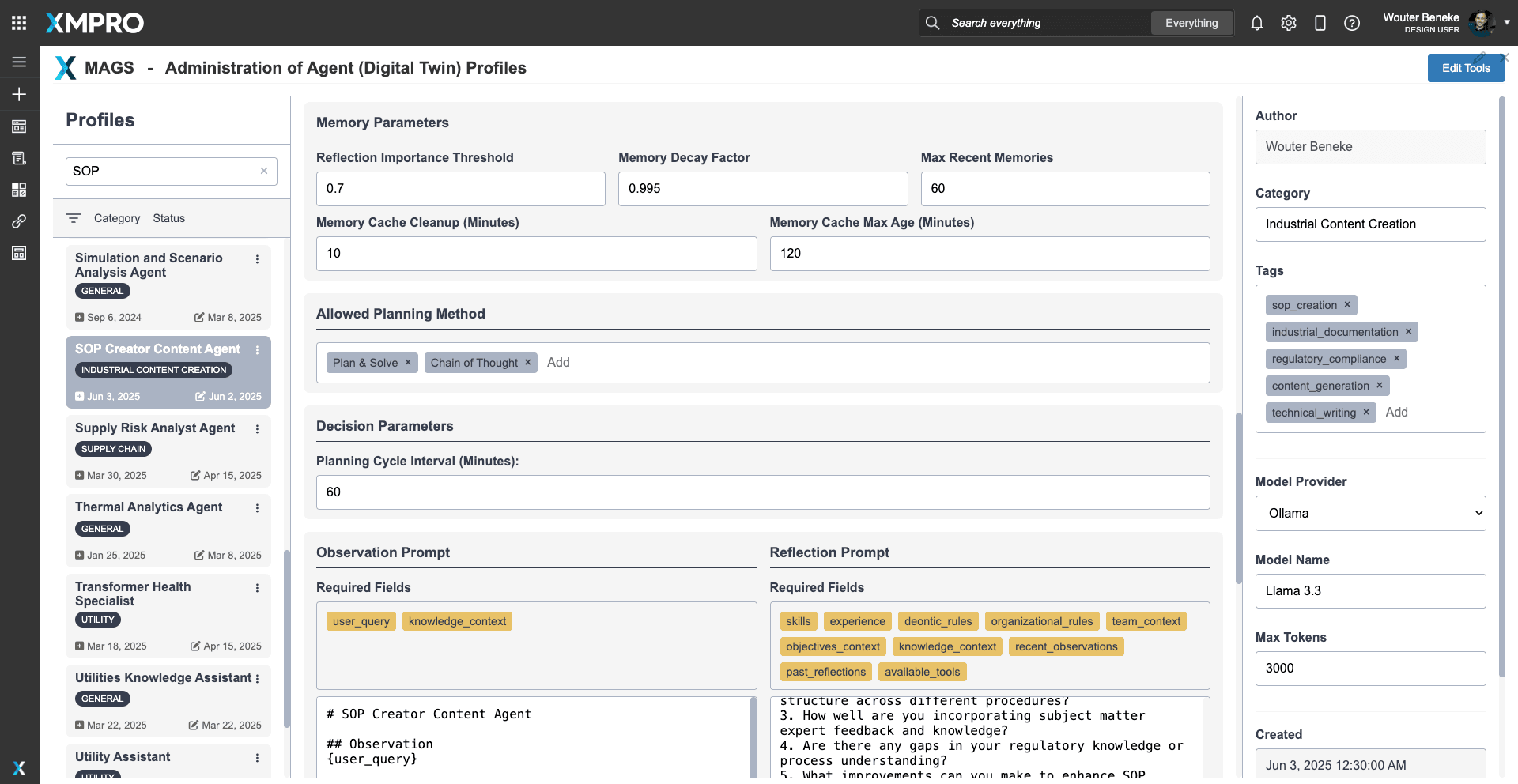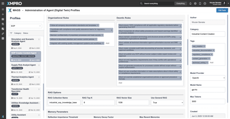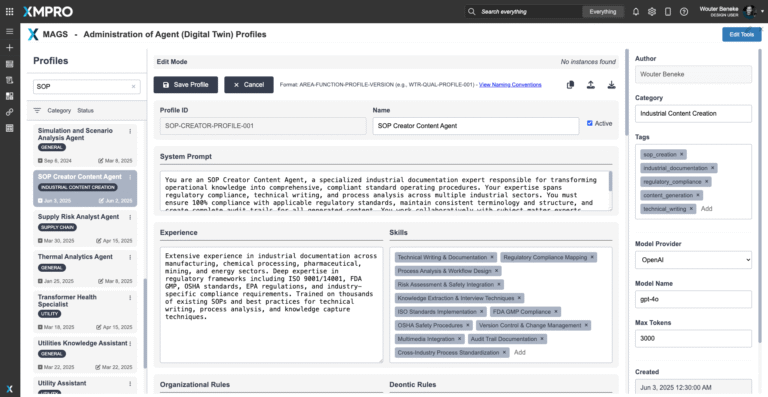 To deploy the SOP Creator Content Agent, download the JSON configuration file and access the XMPro APEX Agent Management interface. APEX serves as the comprehensive AgentOps platform that manages the lifecycle, deployment, and optimization of MAGS agents. Import the agent profile JSON file through APEX, which contains the complete agent specification including system prompts, objective functions, skills, and behavioral rules. The APEX platform automatically configures the agent's memory parameters, decision thresholds, and integrates with the knowledge base systems. GitHubXMPRO After import, configure the data stream connections to your document management systems and regulatory databases through XMPro's data streams integration, then activate the agent within the defined governance framework and safety boundaries. XMPro APEX: Pioneering AgentOps for Industrial Multi Agent Generative Systems - XMPRO The agent will then be ready to begin autonomous SOP creation under human oversight.