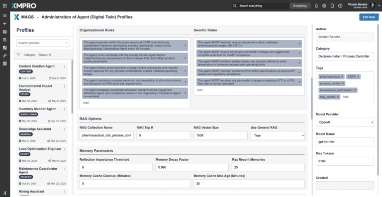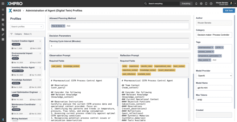 Designed to operate within XMPro's Multi-Agent Generative Systems MAGS framework, this agent serves as your facility's productivity maximizer, continuously learning and improving reactor utilization while coordinating with quality and safety agents to ensure optimal output never compromises product integrity.