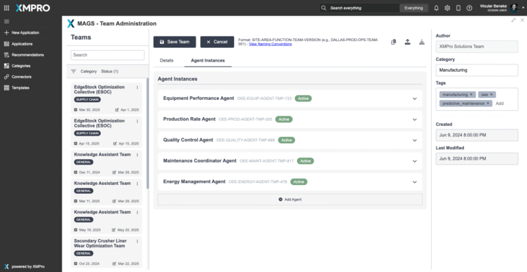 XMPro agent teams are fully configurable to match your specific maintenance goals. The Autonomous Agentic AI Team for Advanced Predictive Maintenance provides a flexible template that combines core agents for prediction, planning, and monitoring with advanced agents for root cause analysis, compliance management, and performance tracking. This is true multi-agent intelligence. Each agent contributes specialized expertise, collaborates in a coordinated team, and continuously learns and adapts based on maintenance outcomes. The team can be tailored to your asset portfolio and maintenance priorities, allowing you to start small and scale as your predictive maintenance maturity evolves.
