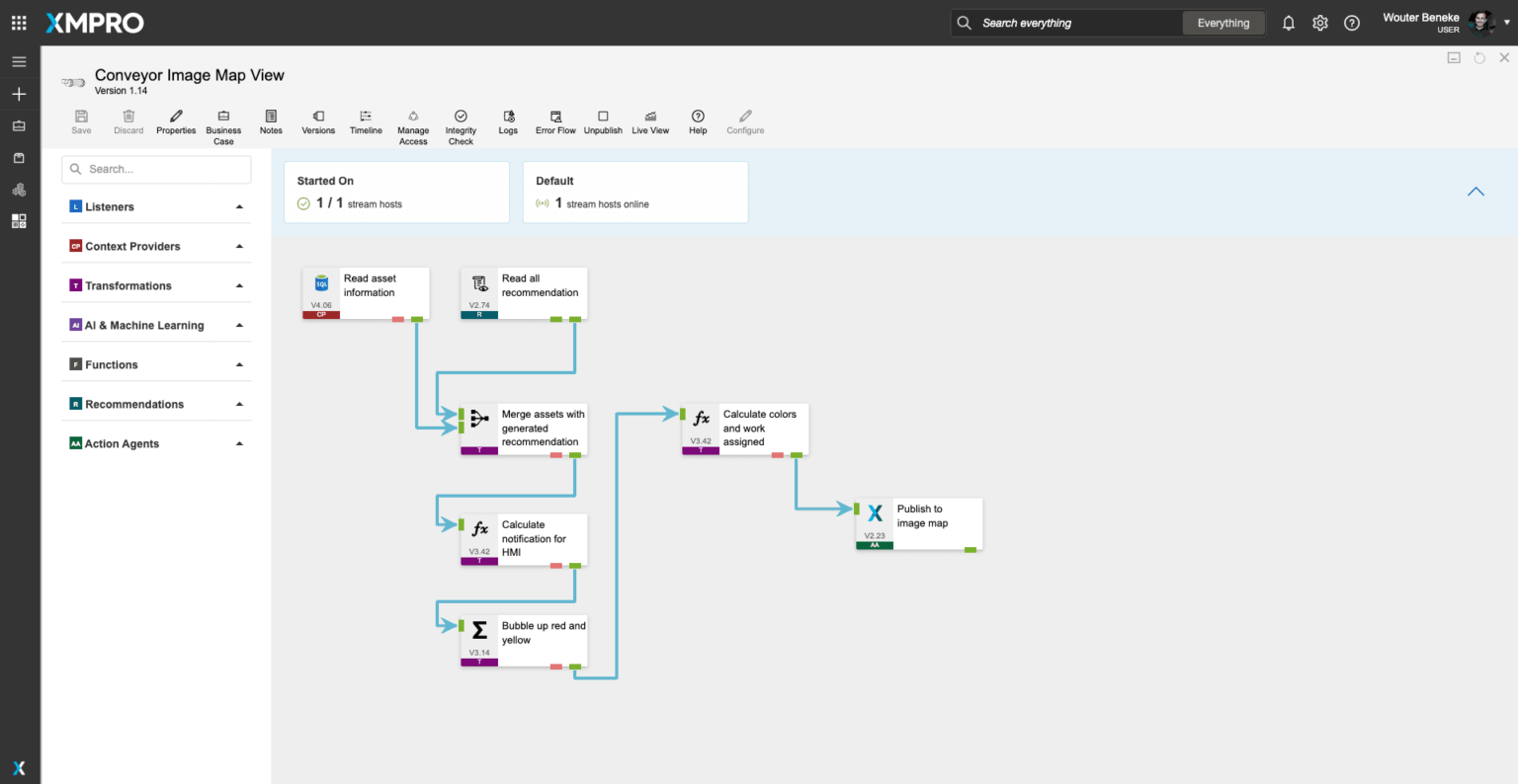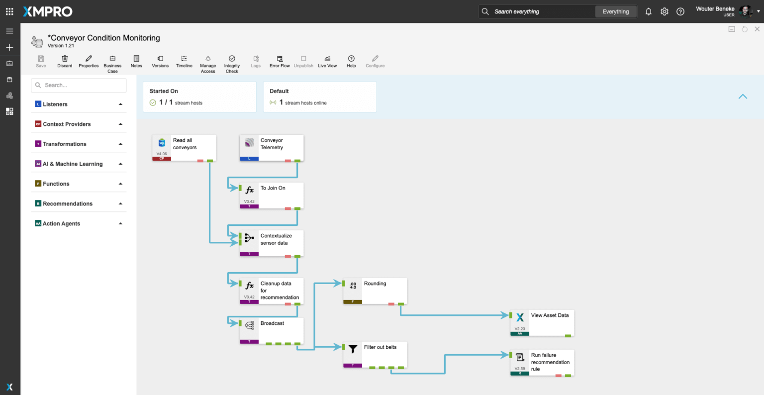XMPRO’s StreamDesigner lets you visually design the data flow and orchestration for your real-time applications. Our drag & drop connectors make it easy to bring in real-time data from a variety of sources, add contextual data from systems like EAM, apply native and third-party analytics and initiate actions based on events in your data.Figure 2: Conveyor Health Condition Monitoring Data Stream