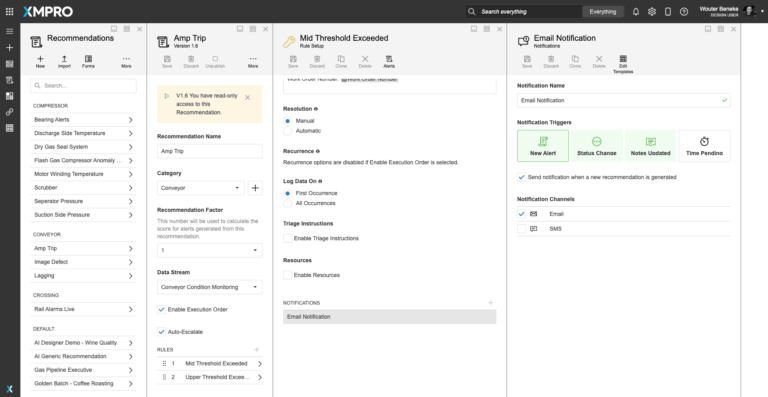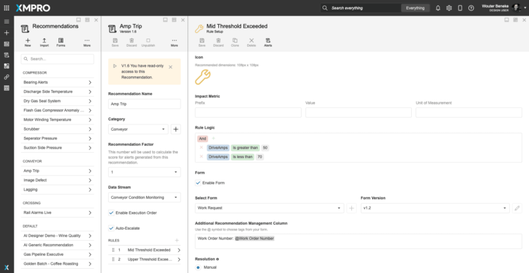 XMPRO Recommendations are advanced event alerts that combine alerts, actions, and monitoring. You can create recommendations based on business rules and AI logic to recommend the best next actions to take when a certain event happens. You can also monitor the actions against the outcomes they create to continuously improve your decision-making.Figure 1. Amperage Exceeded Threshold Recommendation