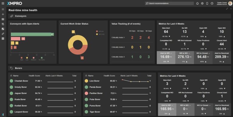 - Health Scores and Alerts: Shows the health scores of different borers, along with the number of alerts over the last four weeks.
