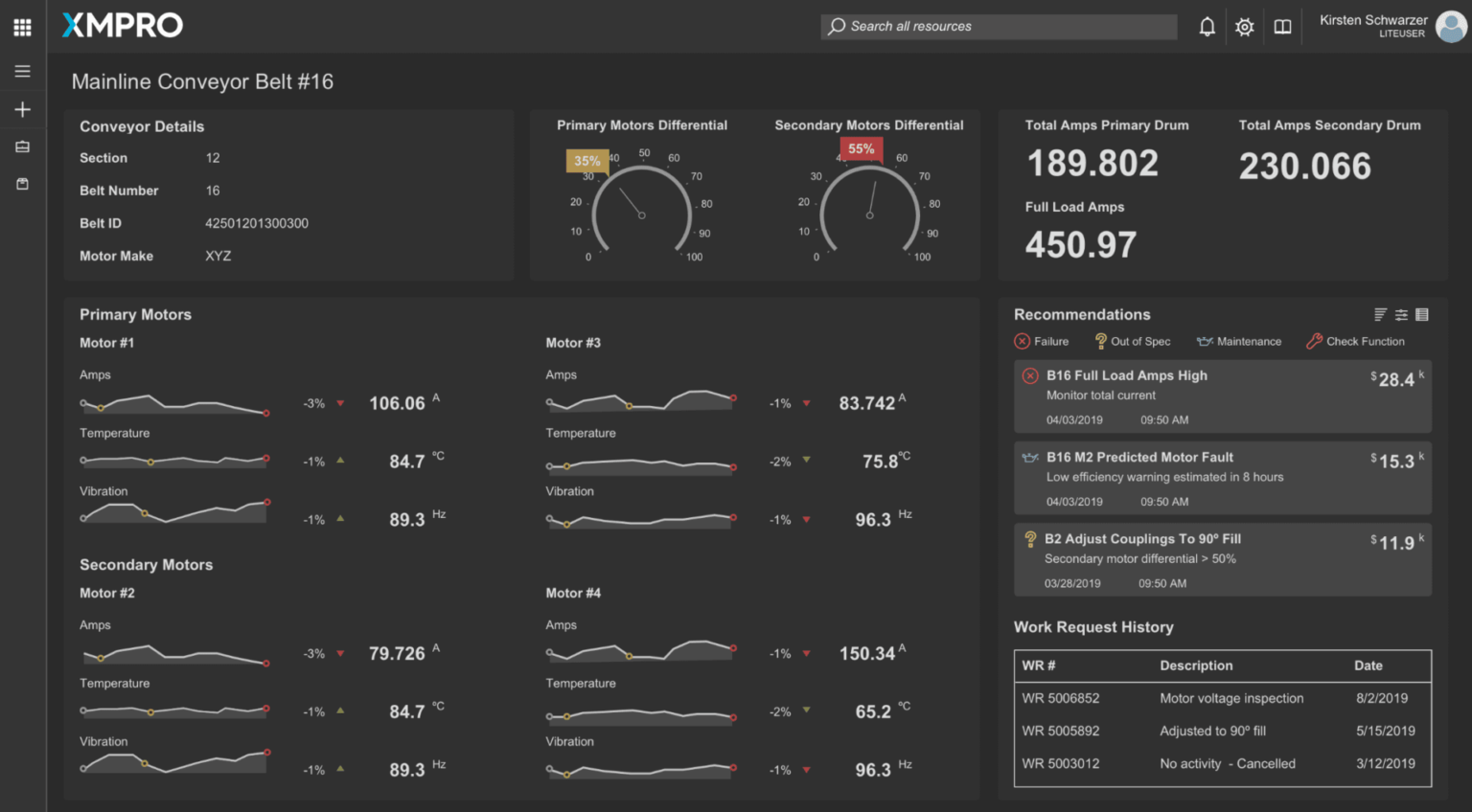 The Mainline Conveyor #16 dashboard offers an in-depth analysis of the primary and secondary motors, providing real-time data and predictive maintenance insights to ensure optimal performance and prevent unexpected failures.