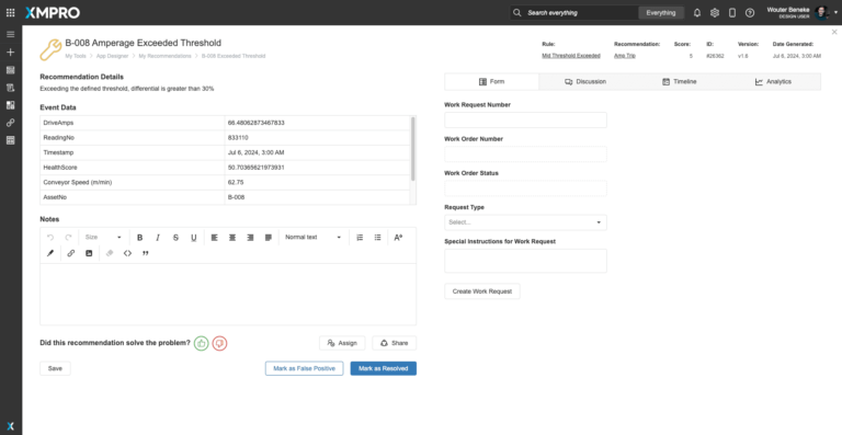 This recommendation identifies an issue with the amperage exceeding the defined threshold, indicating a differential greater than 30%. The event data includes details such as drive amps, reading number, timestamp, health score, conveyor speed, and asset number. Users can add notes, mark the recommendation as solved or a false positive, assign the recommendation, share it, and create a work request with special instructions if necessary. This structured approach ensures that potential issues are efficiently addressed and resolved to maintain optimal conveyor performance.