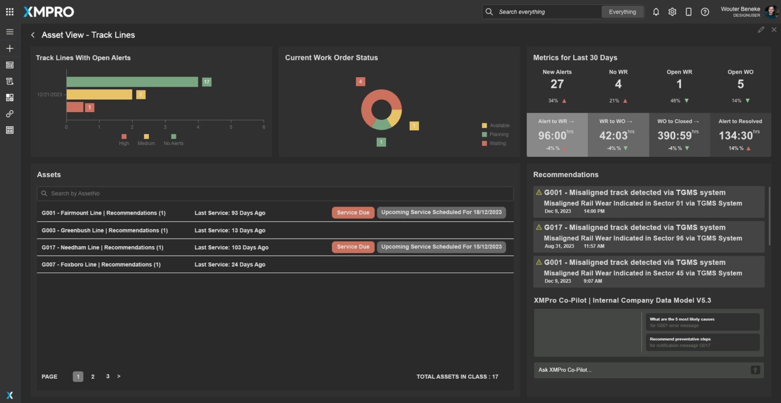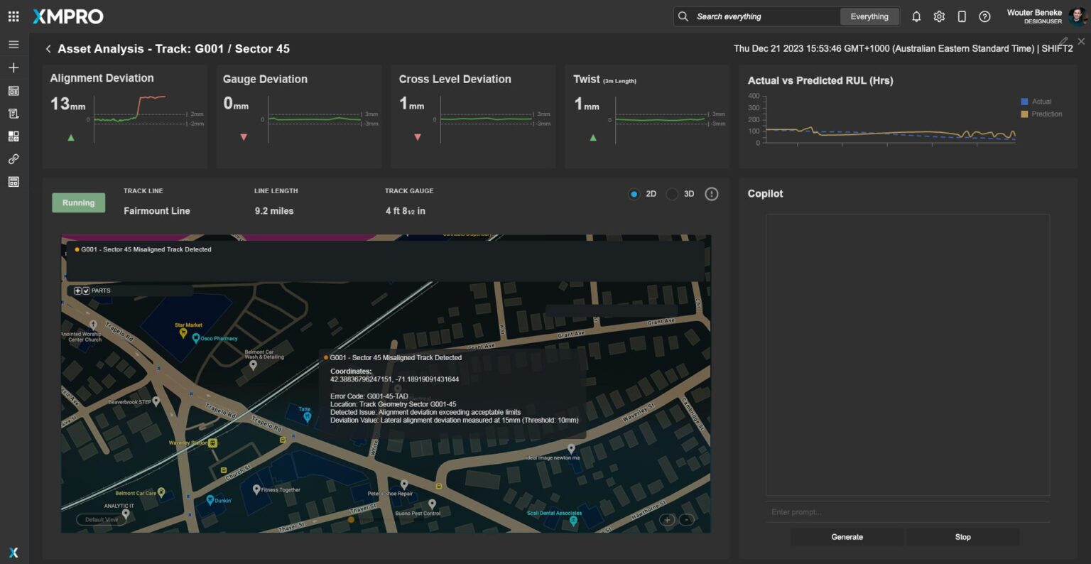 XMPro Co-Pilot Integration: Incorporating XMPro Co-Pilot, this feature utilizes AI, trained on datasets such as historical track data and maintenance records, to provide specific guidance for issues related to Sector G001-45. This AI-driven assistance supports informed decision-making and enhances maintenance efficiency.