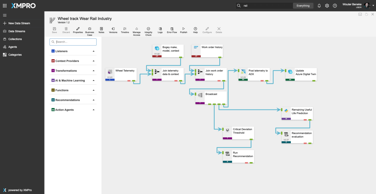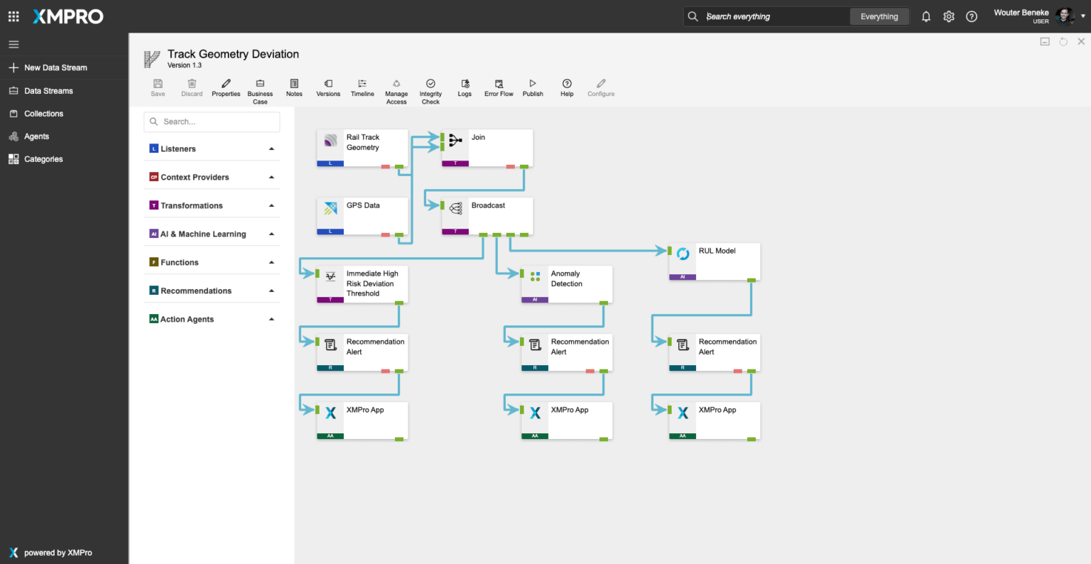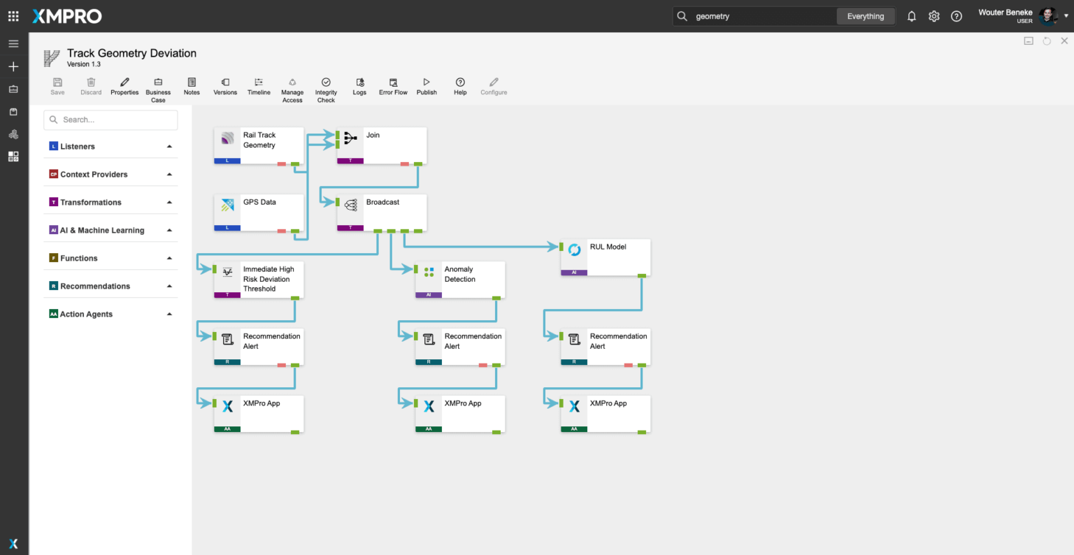 - Data Integration and Predictive Analytics:XMPro's StreamDesigner integrates sensor data, applying machine learning algorithms to predict potential track issues before they escalate into derailment risks.