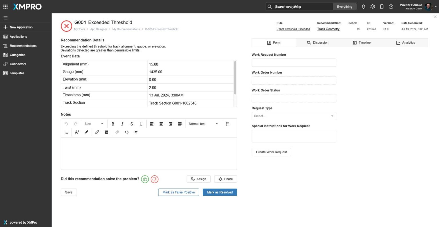 XMPRO Recommendations are advanced event alerts that combine alerts, actions, and monitoring. You can create recommendations based on business rules and AI logic to recommend the best next actions to take when a certain event happens. You can also monitor the actions against the outcomes they create to continuously improve your decision-making.Figure 1: Track Misalignment Threshold Recommendation