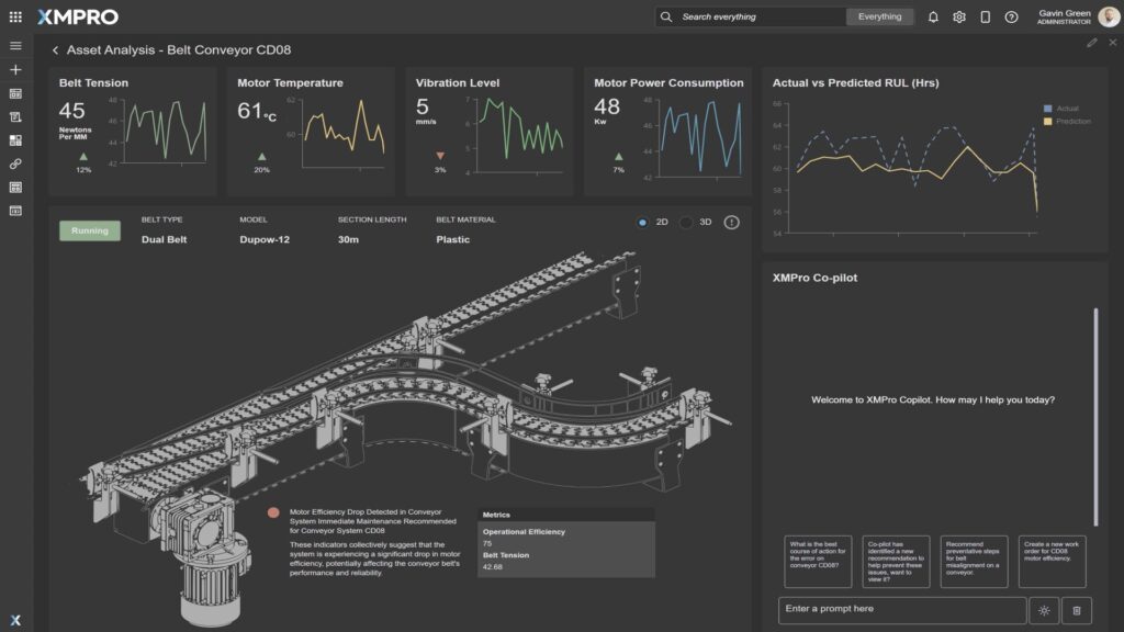 Digital Twin Simulation for Conveyor: XMPro AO Platform creates a digital twin of the conveyor system, allowing for failure scenario analysis and operational adjustments in a virtual environment. This capability enables testing and optimization of maintenance strategies without impacting production, leading to improved system performance.