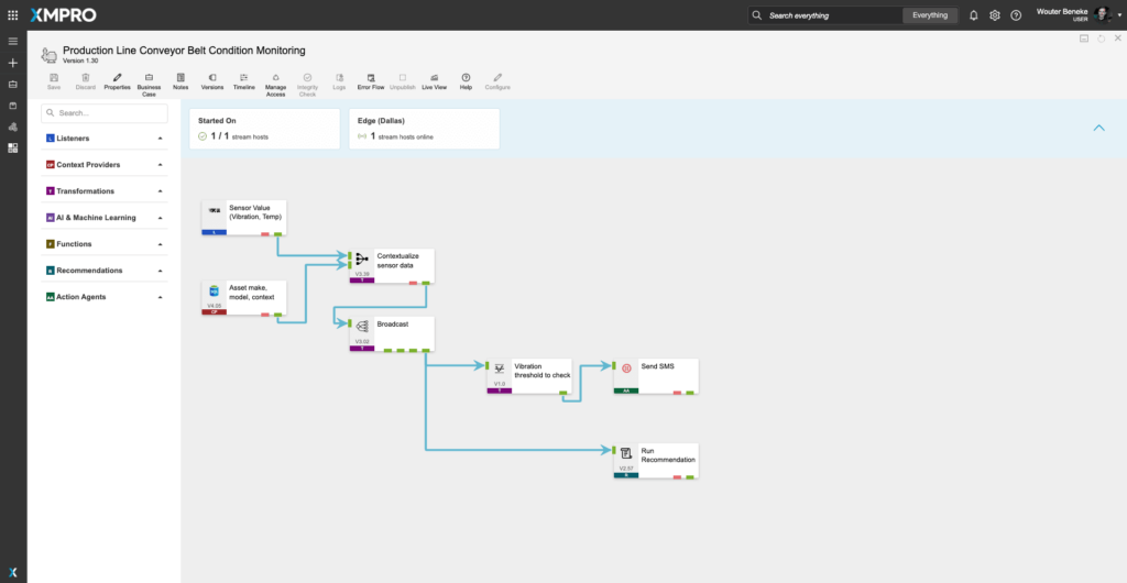 XMPRO’s StreamDesigner lets you visually design the data flow and orchestration for your real-time applications. Our drag & drop connectors make it easy to bring in real-time data from a variety of sources, add contextual data from systems like EAM, apply native and third-party analytics and initiate actions based on events in your data.