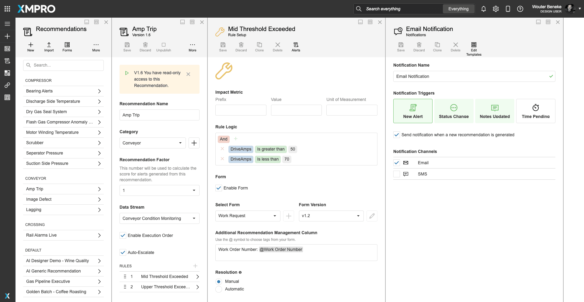 XMPRO Recommendations are advanced event alerts that combine alerts, actions, and monitoring. You can create recommendations based on business rules and AI logic to recommend the best next actions to take when a certain event happens. You can also monitor the actions against the outcomes they create to continuously improve your decision-making.Figure 1. Amperage Exceeded Threshold Recommendation