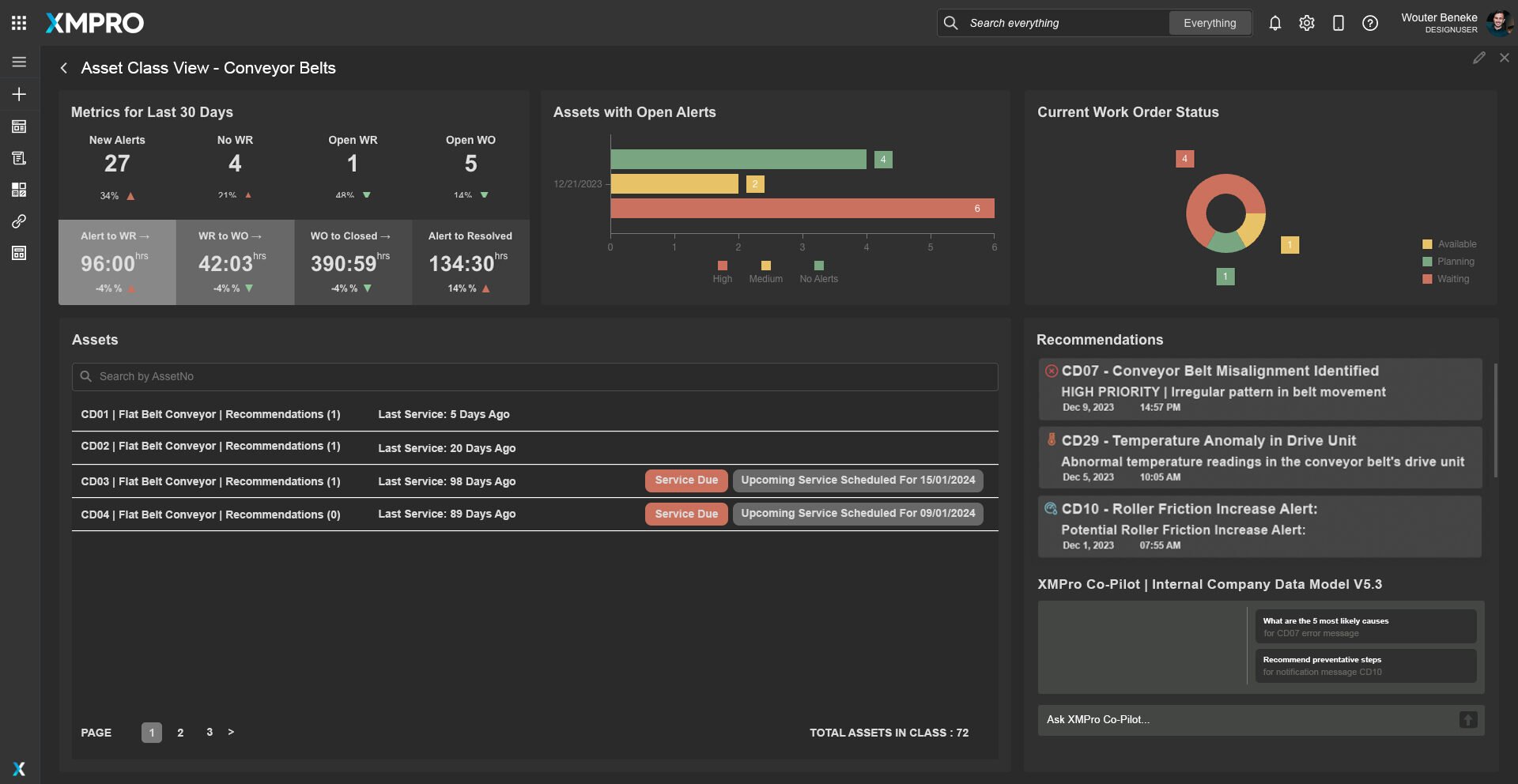 The dashboard lists recent recommendations triggered for specific conveyor belt system assets, complete with detailed views and actionable steps. This empowers maintenance teams with data-driven, actionable insights for immediate and future maintenance actions. Such a proactive approach is crucial in addressing minor issues before they escalate into major problems, ensuring high operational efficiency.