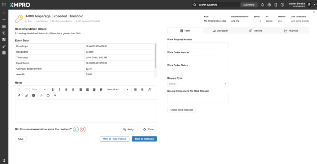 This recommendation identifies that the amperage for the motor on conveyor drive B-008 has exceeded the defined threshold by more than 30%. The event data includes details such as drive amps, reading number, timestamp, health score, conveyor speed (measured in meters per minute), and asset number. Users can add notes, assign the recommendation, share it, and create a work request with special instructions. The system tracks whether the recommendation solved the problem and provides options to mark it as a false positive or resolved. This setup ensures timely response to motor issues on the conveyor drive by providing detailed event data and facilitating immediate action through work requests and documentation.