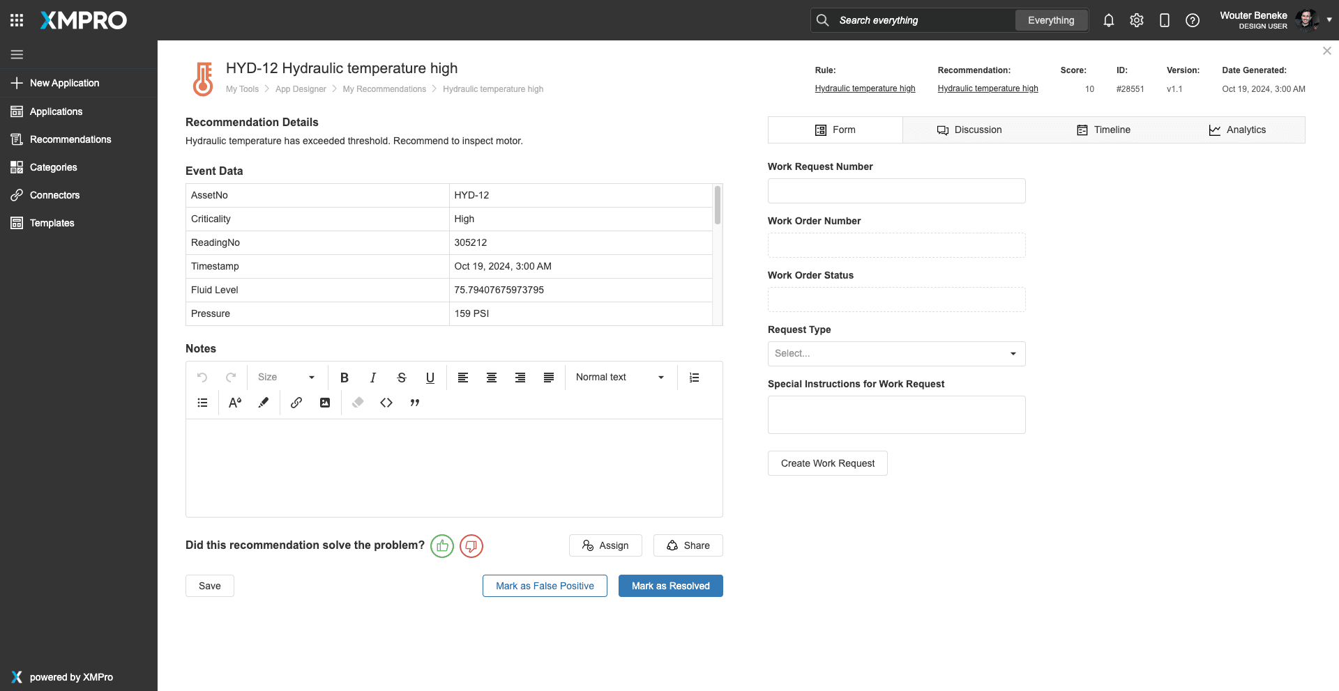 This high temperature exception recommendation identifies an issue with the hydraulic system's operating temperature exceeding the specified threshold. It provides event data, including hydraulic ID, location, temperature reading, timestamp, motor current, and coolant pressure. Users can add notes, mark the recommendation as resolved or a false positive, and create a work request with special instructions if necessary.