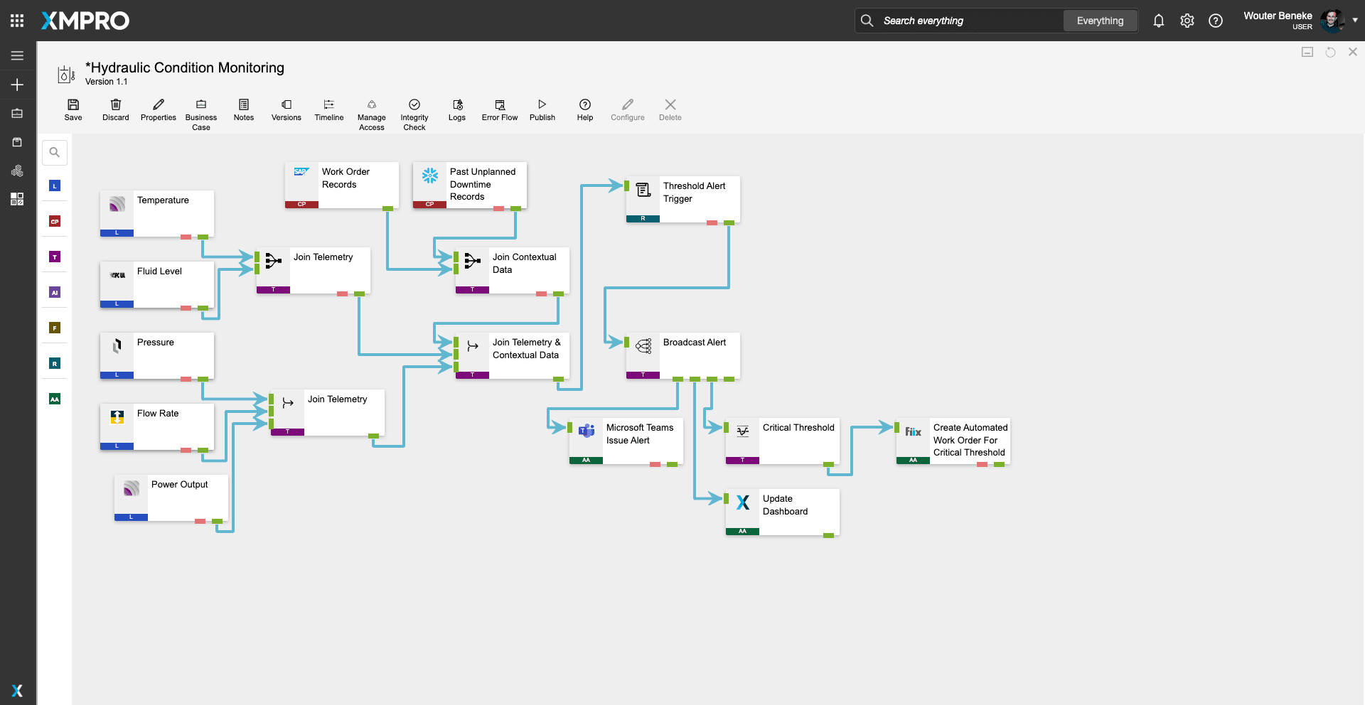 XMPro’s StreamDesigner allows manufacturers to visually design data flows for real-time applications. This includes bringing in data from multiple sensors (e.g., pressure, temperature, flow monitors) and contextualizing it with operational data. The result: streamlined hydraulic system management that supports both maintenance and performance optimization.The system then broadcasts this information via multiple channels, including email notifications, Microsoft Teams alerts, and an alert dashboard. This comprehensive monitoring setup ensures that stakeholders are promptly informed of critical issues, enabling proactive maintenance and preventing potential failures, thus optimizing the hydraulic system’s operational efficiency and reducing downtime.