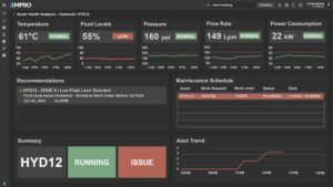 - Recommendations and Work Orders: The system has detected a low fluid level anomaly in HYD12 located in Zone A, recommending immediate scheduling of a work order to prevent potential system failure. The recommendation is time-stamped to ensure timely interventions and avoid unnecessary delays.