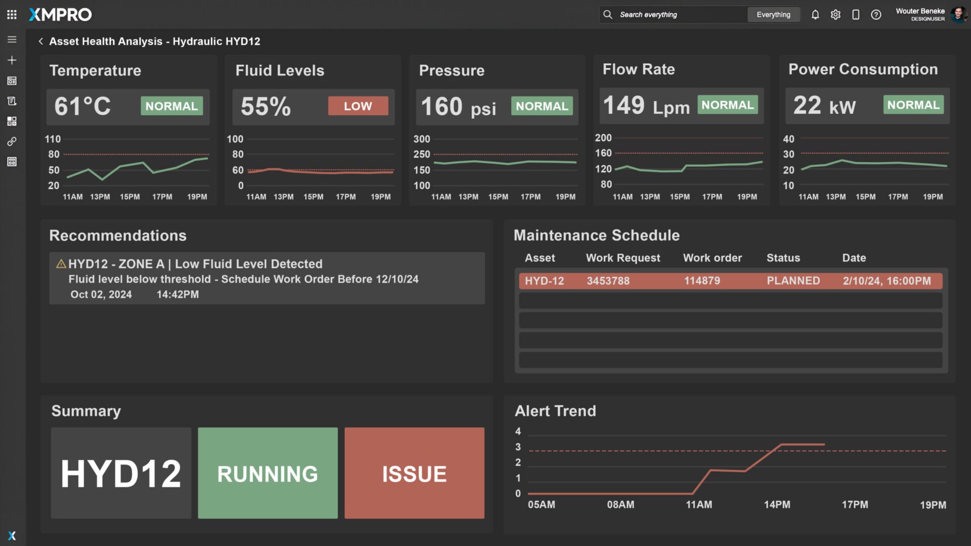 Automatic alerts based on data analysis ensure that operators are informed the moment a hydraulic system's performance dips below acceptable levels. XMPro generates actionable recommendations in real time.