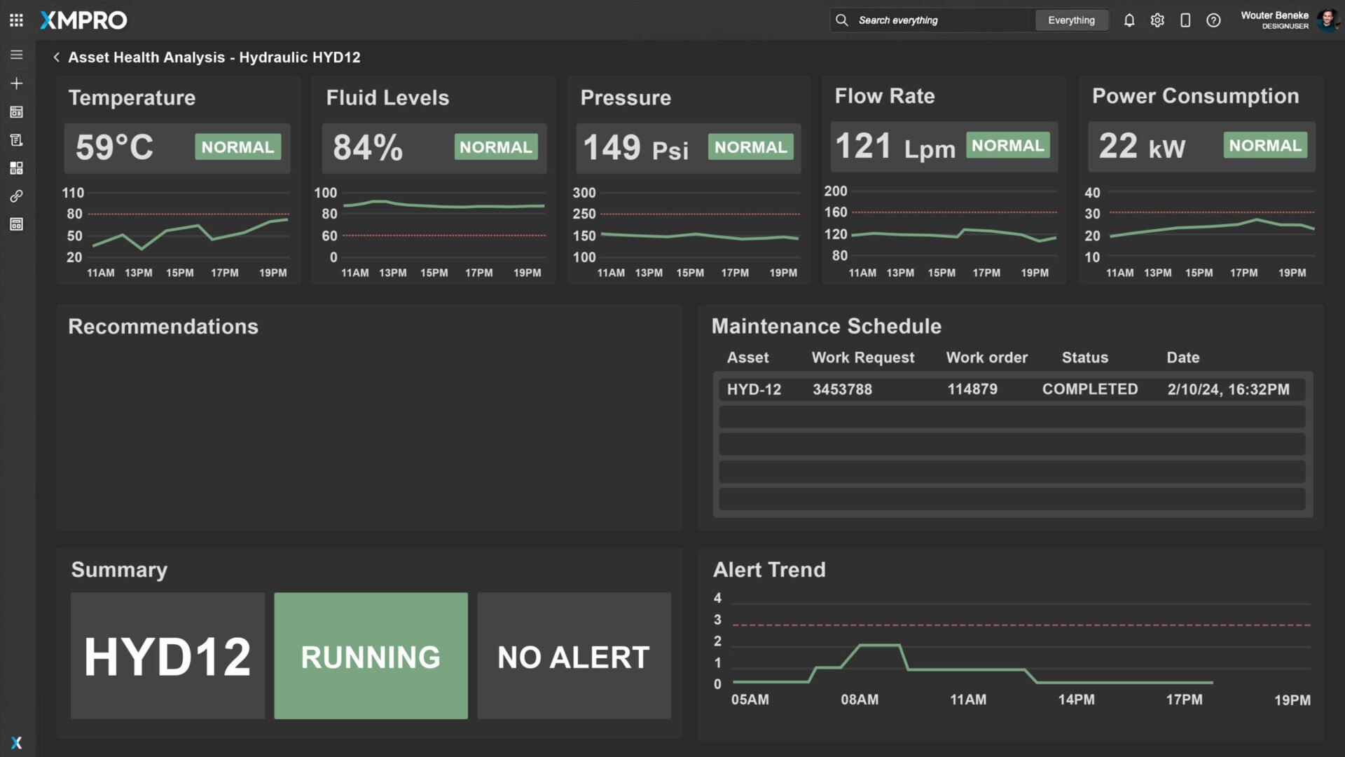 - No Alerts or Recommendations: In this state, no alerts or recommendations are required, confirming that the system is running smoothly. The absence of alerts reassures the maintenance team that the hydraulic system is in optimal condition.