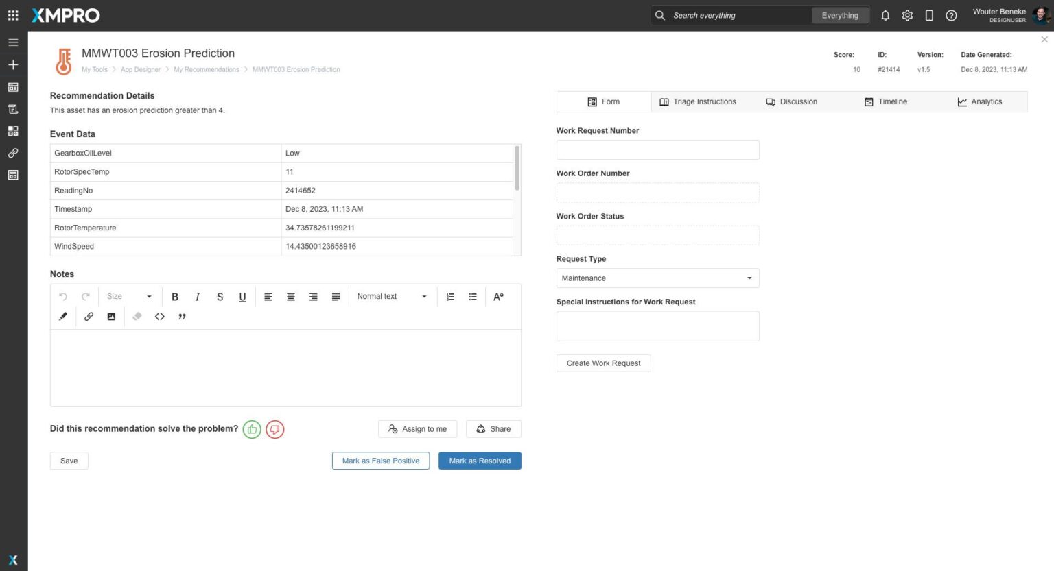 This recommendation for wind turbine MMWT003 identifies an erosion prediction greater than 4. The event data provided includes gearbox oil level (low), rotor specific temperature (11), reading number (2414652), timestamp (Dec 8, 2023, 11:13 AM), rotor temperature (34.73578261199211), and wind speed (14.43500123658916). Users can add notes, assign the recommendation, share it, and create a work request with special instructions for maintenance. The system tracks whether the recommendation solved the problem and provides options to mark it as a false positive or resolved. This setup ensures timely response to potential erosion issues, optimizing turbine performance and longevity through proactive maintenance actions.