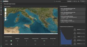 This advanced dashboard provides operators of renewable energy assets, specifically wind and solar farms, with a comprehensive view of their infrastructure. It features an interactive map that dynamically updates with the condition of various renewable assets, including wind turbines and solar panels, offering a clear visual representation of the operational health of these energy systems. Each asset on the map is marked with a color-coded status icon, indicating its current operational state, including active status and any alerts or error messages related to performance or maintenance needs.