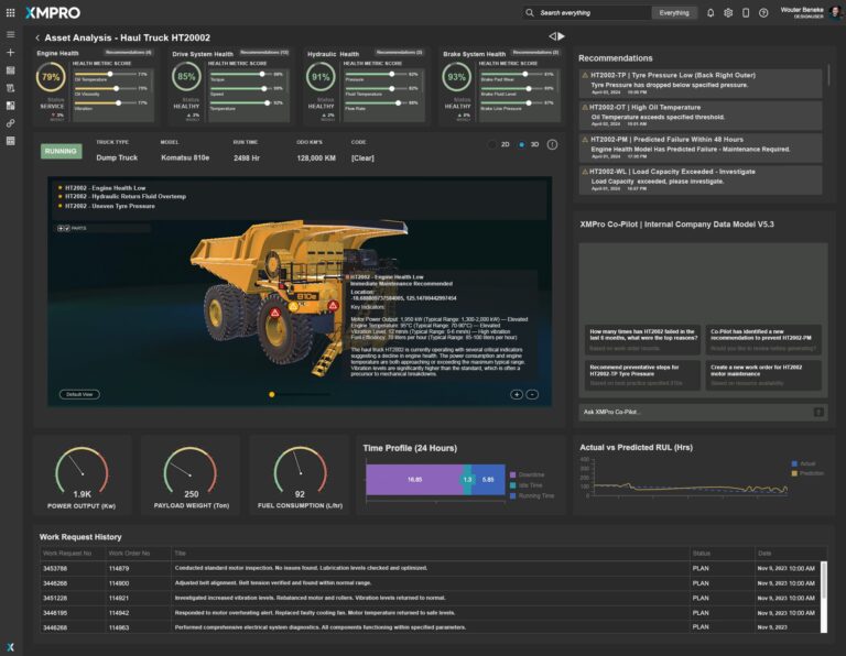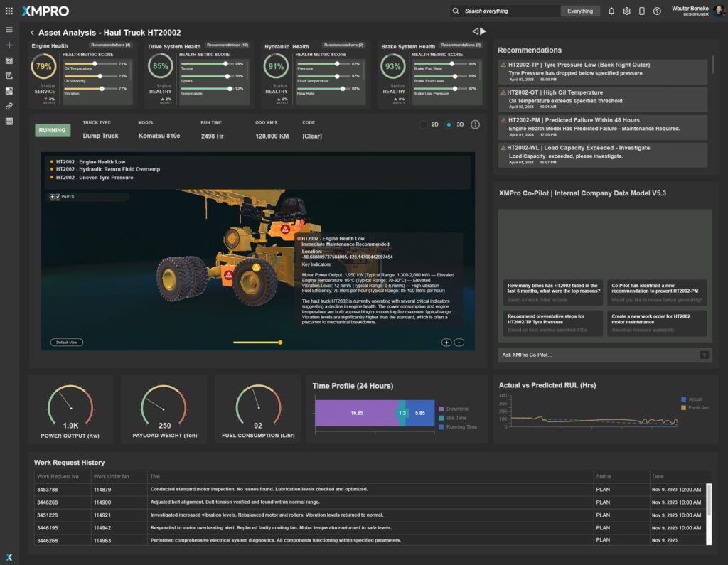 XMPro Co-Pilot integration offers AI-driven maintenance suggestions based on data trends. The dashboard records maintenance history, ensuring transparency and continuous performance improvement. This tool combines visualizations, analytics, and AI to maintain mining efficiency and safety.