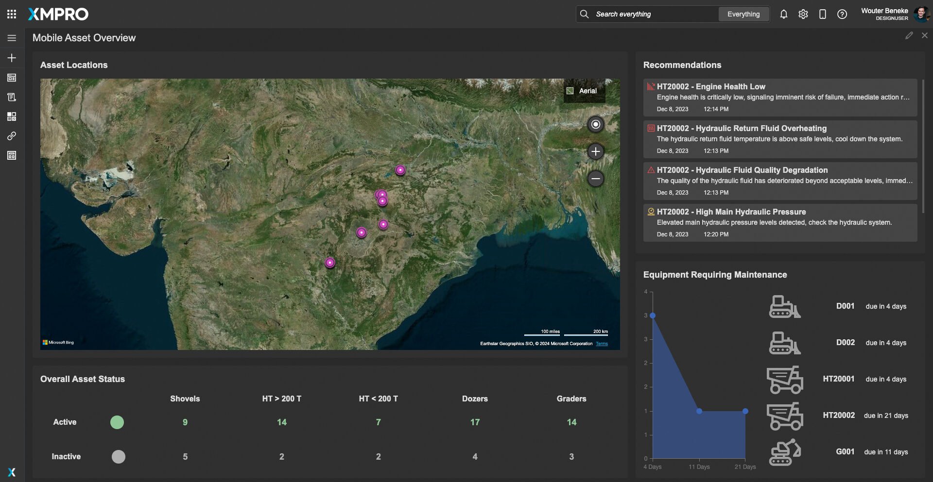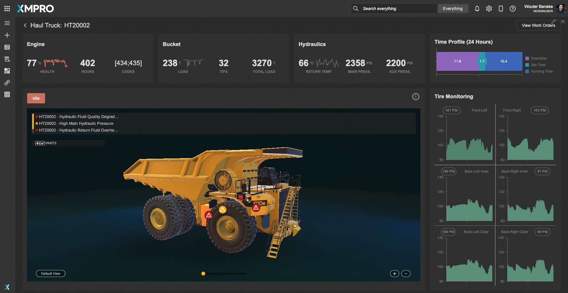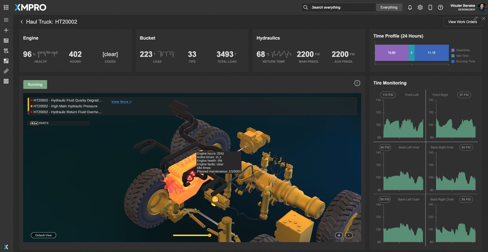 Offering interactive visualizations, the dashboard allows for a detailed examination of equipment, identifying areas prone to wear or imminent failure. Users can interact with both 2D schematics and 3D models, focusing on critical subsystems such as engines, hydraulics, and drivetrains.