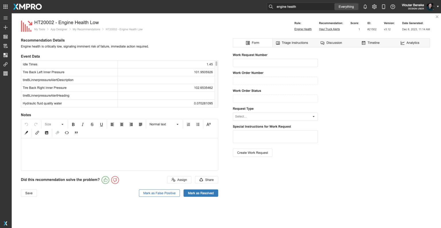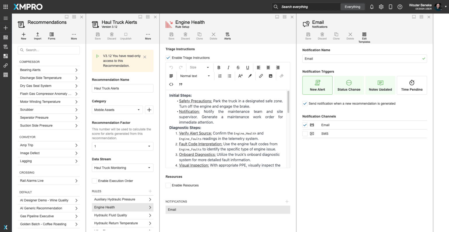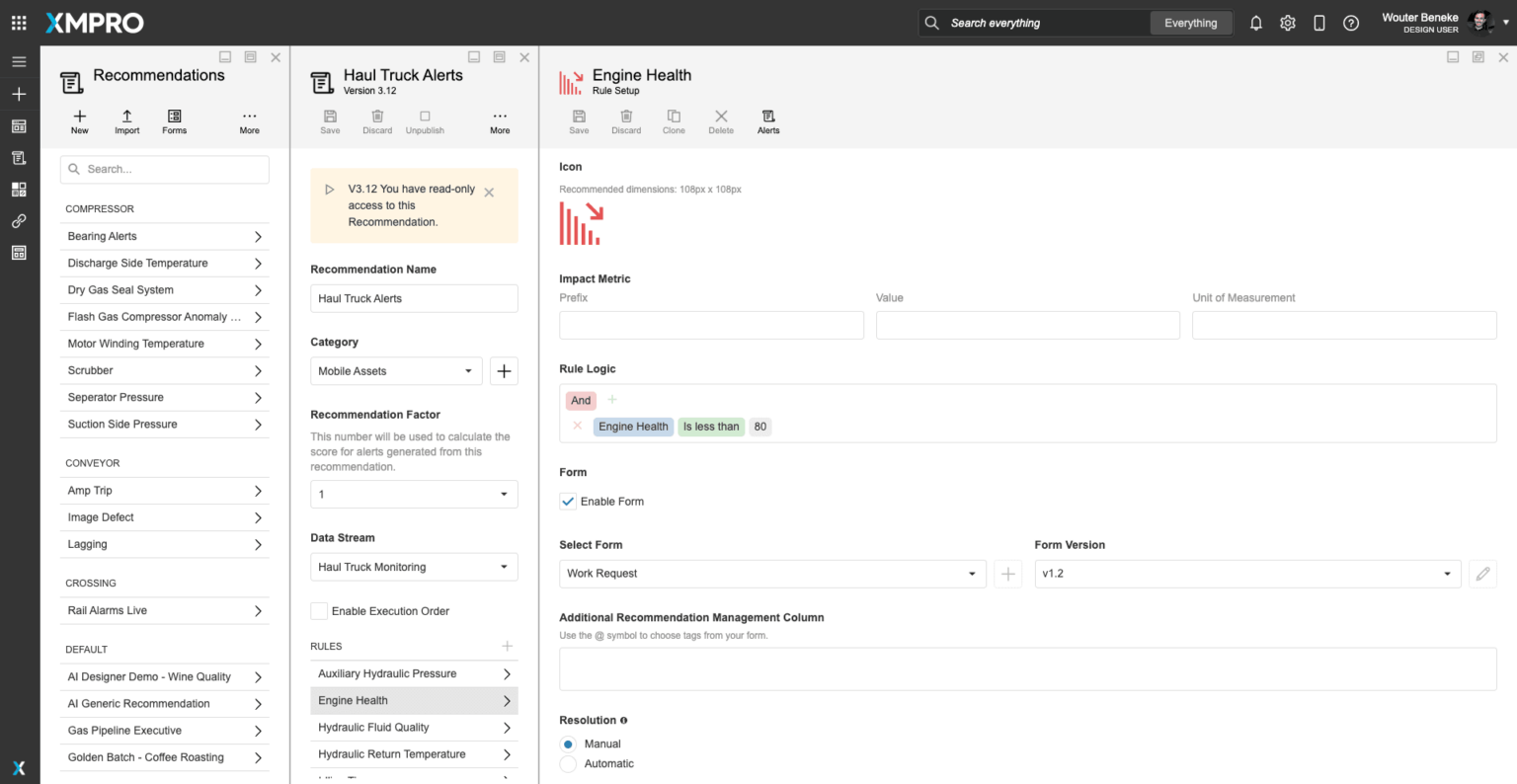 XMPRO Recommendations are advanced event alerts that combine alerts, actions, and monitoring. You can create recommendations based on business rules and AI logic to recommend the best next actions to take when a certain event happens. You can also monitor the actions against the outcomes they create to continuously improve your decision-making.XMPro App Designer