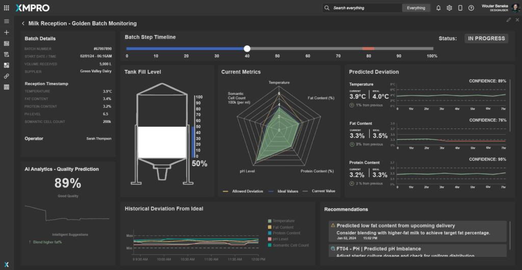 XMPro’s platform proactively provides recommendations to address potential issues in the process, such as culture viability concerns, firmness adjustments, and parameter optimizations for pasteurization. It also advises on final checks before commencement and during aging.