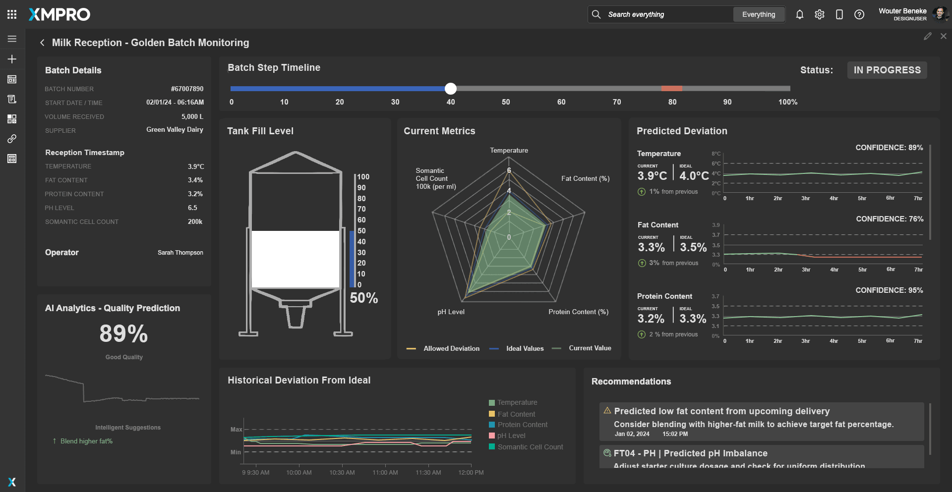 To assist in decision-making, XMPro provides specific recommendations. For instance, it advises on expected low-fat content from an upcoming delivery and suggests blending with higher-fat milk to achieve the target percentage. Predictive alerts for potential pH imbalances are also provided, prompting checks for starter culture dosage and uniform distribution.