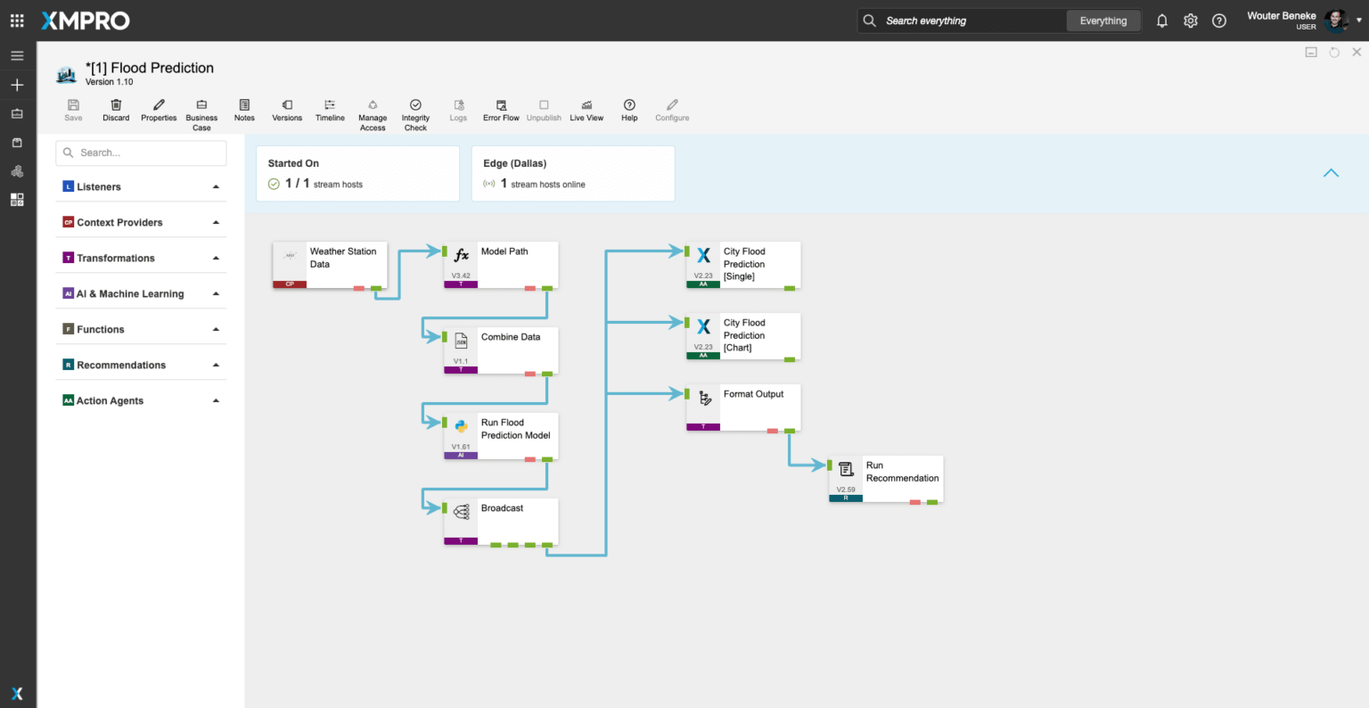 XMPRO’s StreamDesigner lets you visually design the data flow and orchestration for your real-time applications. Our drag & drop connectors make it easy to bring in real-time data from a variety of sources, add contextual data from systems like EAM, apply native and third-party analytics and initiate actions based on events in your data.Figure 1: Flood Prediction Data Stream