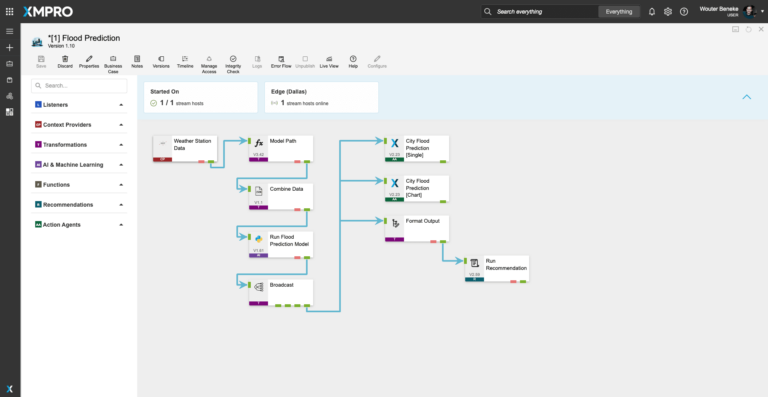 The XMPro App Designer is a no code event intelligence application development platform. It enables Subject Matter Experts (SMEs) to create and deploy real-time intelligent digital twins without programming. This means that SMEs can build apps in days or weeks without further overloading IT, enabling your organization to accelerate and scale your digital transformation.Figure 1. Real-Time Flood Prediction and Response