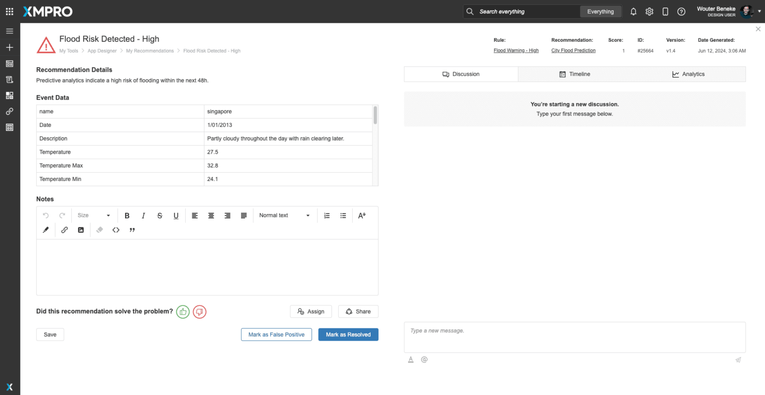 This example flood risk recommendation identifies a high likelihood of flooding within the next 48 hours for the specified location. It provides event data, including the location (Singapore), date, weather description, current temperature, maximum temperature, and minimum temperature. Users can add notes, mark the recommendation as resolved or a false positive, and create an event response with special instructions if necessary.