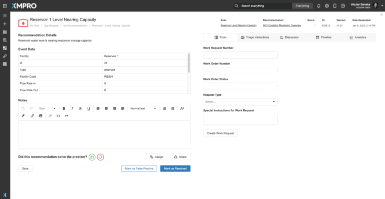 XMPRO Recommendations are advanced event alerts that combine alerts, actions, and monitoring. You can create recommendations based on business rules and AI logic to recommend the best next actions to take when a certain event happens. You can also monitor the actions against the outcomes they create to continuously improve your decision-making.Figure 1: Reservoir 1 Level Nearing Capacity Recommendation