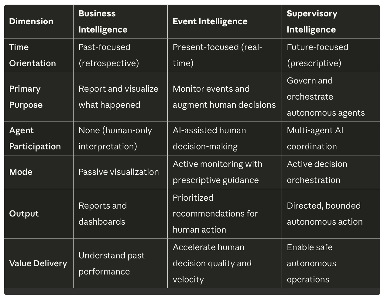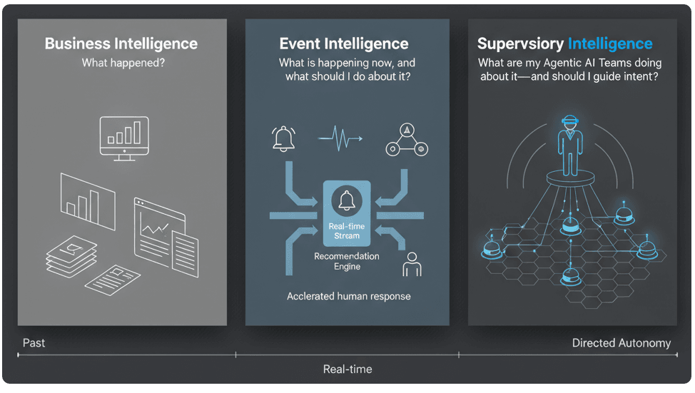 Business Intelligence tells us what happened in the past. Event Intelligence tells us what is happening right now, as events unfold. Supervisory Intelligence tells us what our Agentic AI Teams are doing next and ensures they do it safely, transparently, and within defined constraints. This distinction is structural, not incremental.