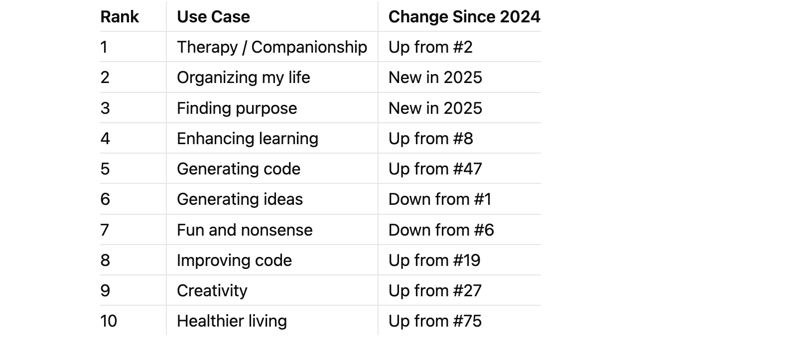 Two entirely new use cases have claimed spots in the top three: "Organizing my life" and "Finding purpose." These highly personal applications have displaced more utilitarian tasks that dominated last year. The trend points toward AI as a partner rather than just a tool.