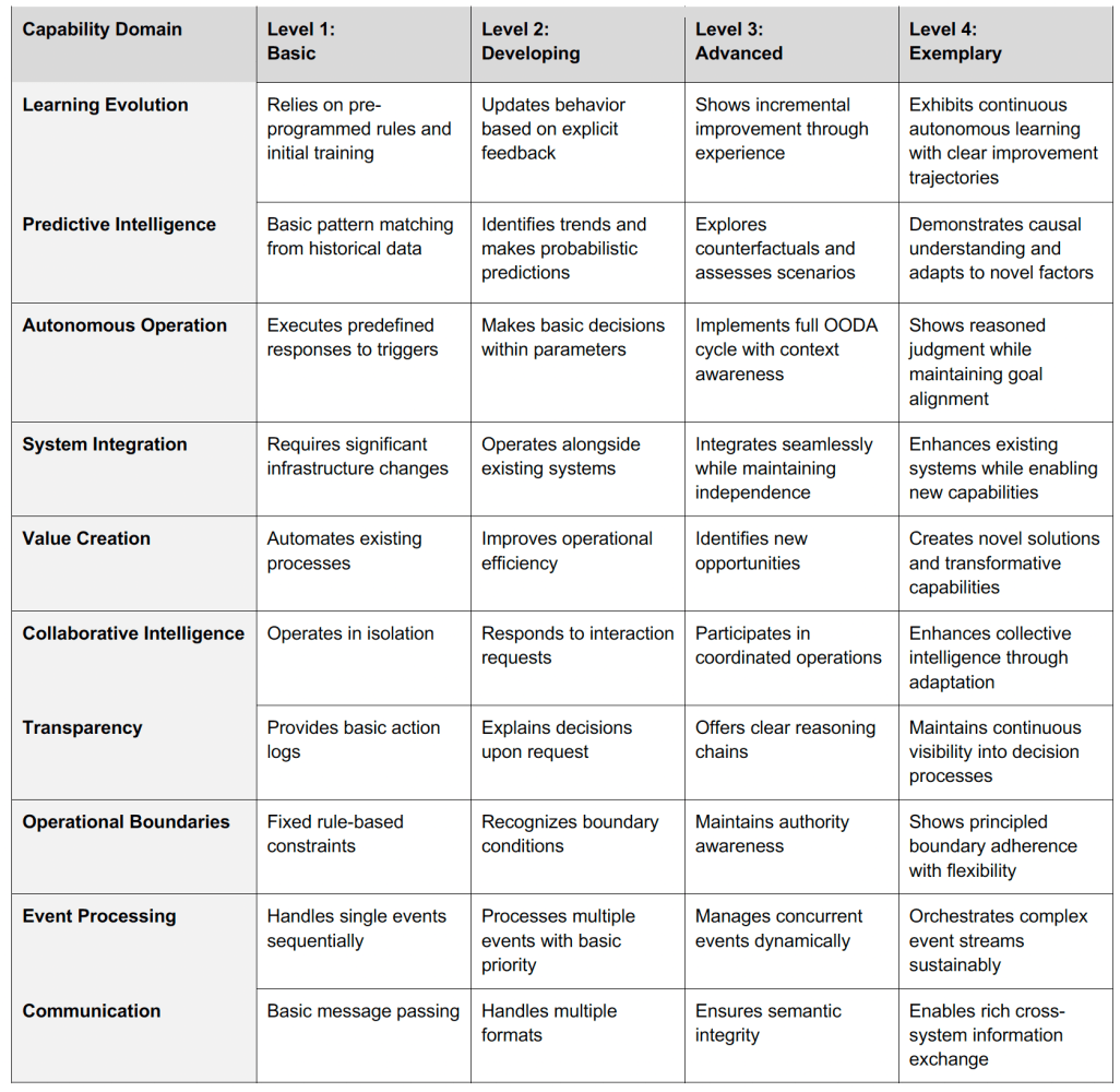 The progression across levels should demonstrate increasing autonomy, sophistication, and operational value while maintaining alignment with organizational objectives and ethical constraints.