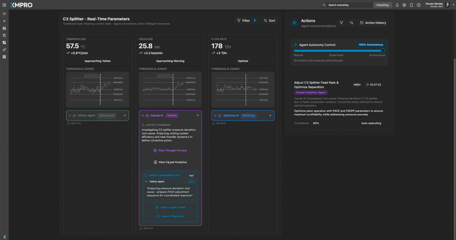 XMPro MAGS achieves this separation by maintaining agent definitions, workflows, and knowledge graphs independently from underlying AI model implementations. The same operational agent can use different AI models for different capabilities including language understanding, anomaly detection, and optimization, and you don't need agent redesign when better models become available.